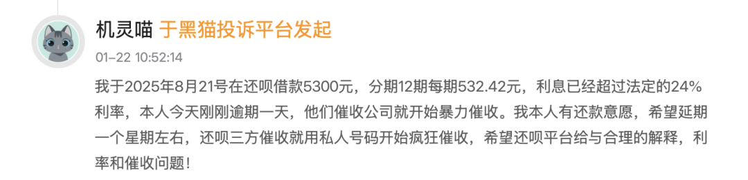1月22日,一位用户在黑猫平台投诉还呗暴力催收与高利贷,并要求停止催收,调整利息。“我于2025年8月21号在还呗借款5300元,分期12期每期532.42元,利息已经超过法定的24%利率,本人今天刚刚逾期一天,他们催收公司就开始暴力催收。”该用户表示,“本人有还款意愿,希望延期一个星期左右,还呗三方催收用私人号码开始疯狂催收,希望还呗平台对利率和催收问题给予合理的解释!”