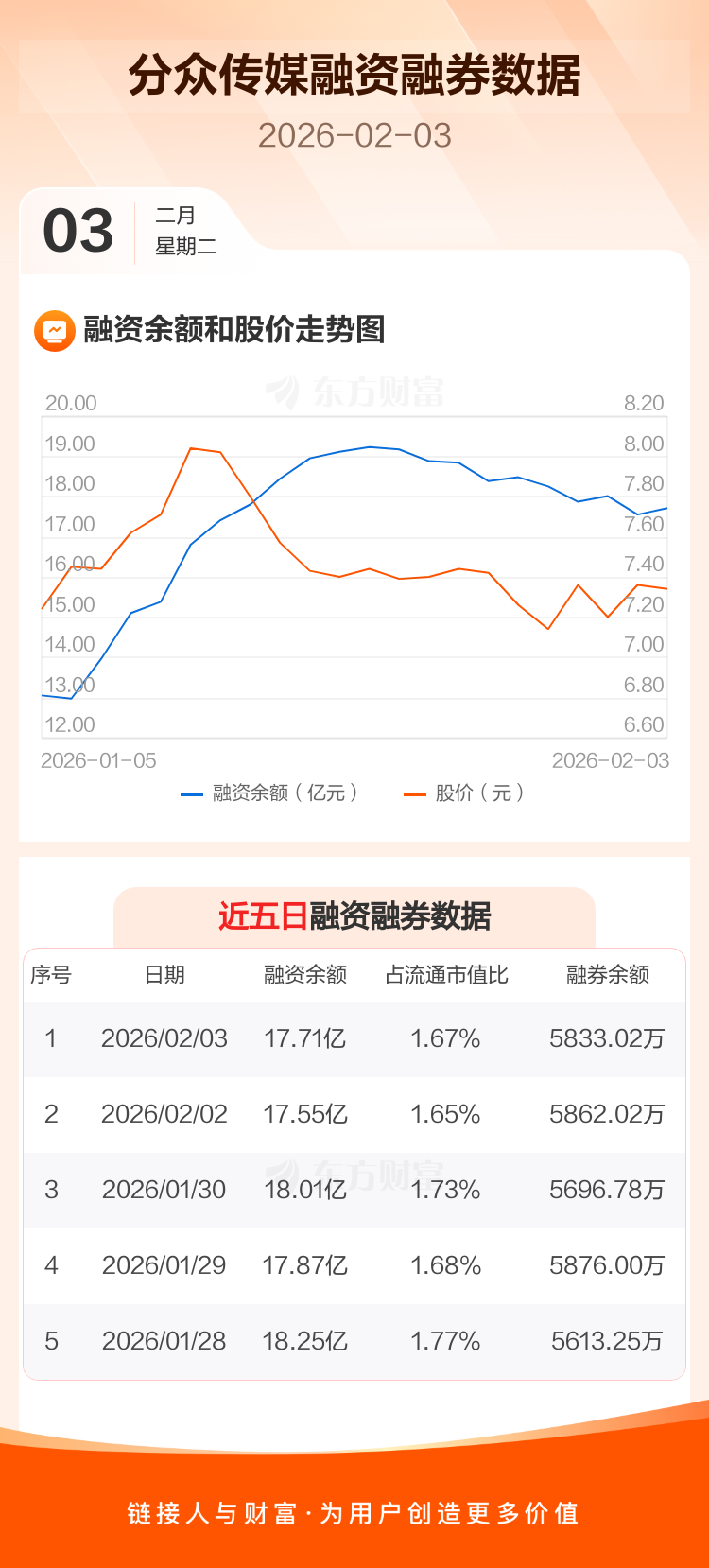 交易所最新数据显示,分众传媒于2026年2月3日获融资买入6650.92万元,融资偿还5074.64万元,当日融资净买入1576.28万元。目前,该股融资余额17.71亿,占流通市值比例为1.67%。