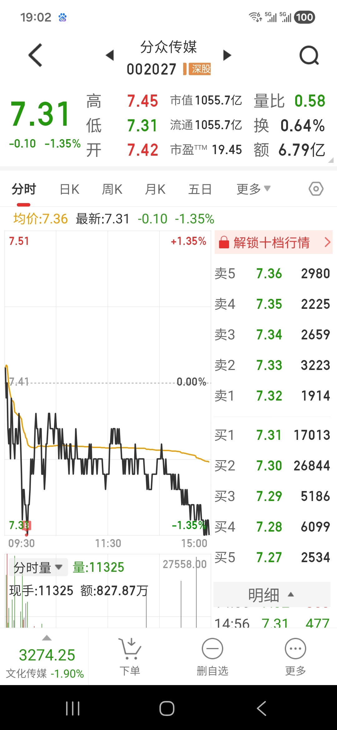 $分众传媒(SZ002027)$ 今日早盘7.31元买了一点,还以为是买到今日的低点,谁知道收市又回落到7.31元,唉买了一个寂寞!