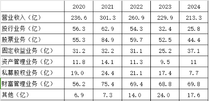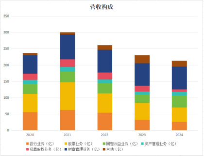 2020年公司三大支柱业务是投行、财富管理和股票,三者的营收基本呈1:1:1分布,到了2024年,财富管理已经遥遥领先,投行业务也被固定收益业务超越,退居第四。