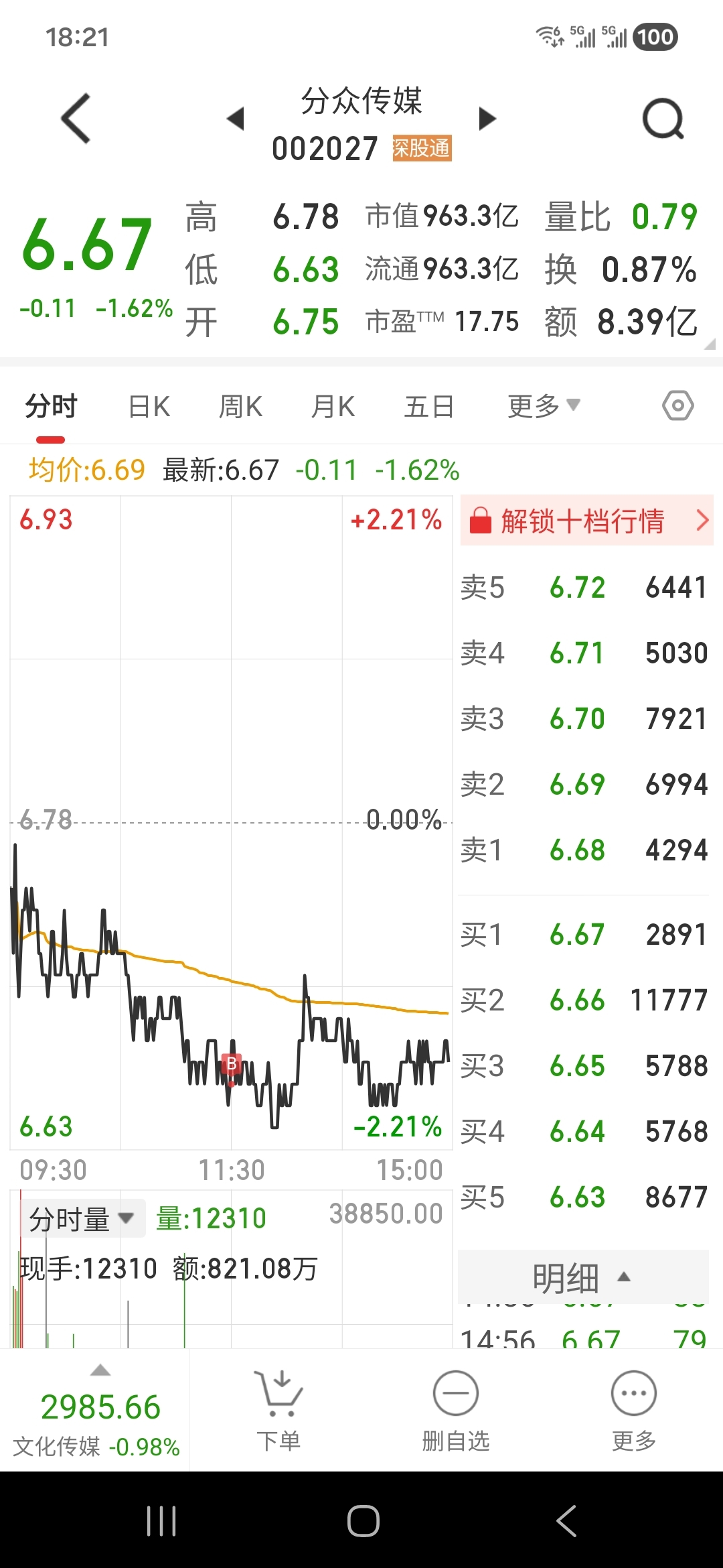 分众传媒不知不觉已经十连阴了,走势很弱比药煲还要弱,节后一条阳K线都没有。今日6.66元加了一点,希望明日有个小反弹!