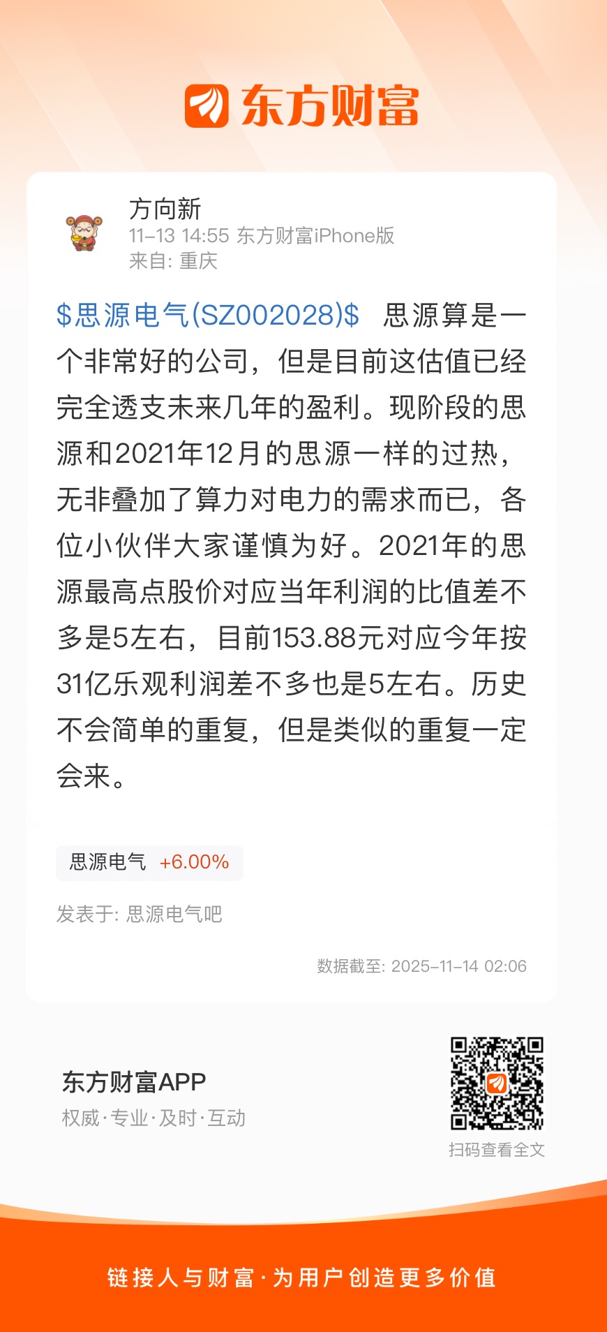 $思源电气(SZ002028)$ 思源算是一个非常好的公司,但是目前这估值已经完全透支未来几年的盈利。现阶段的思源和2021年12月的思源一样的过热,无非叠加了算力对电力的需求而已,各位小伙伴大家谨慎为好。2021年的思源最高点股价对应当年利润的比值差不多是5左右,目前153.88元对应今年按31亿乐观利润差不多也是5左右。历史不会简单的重复,但是类似的重复一定会来。
