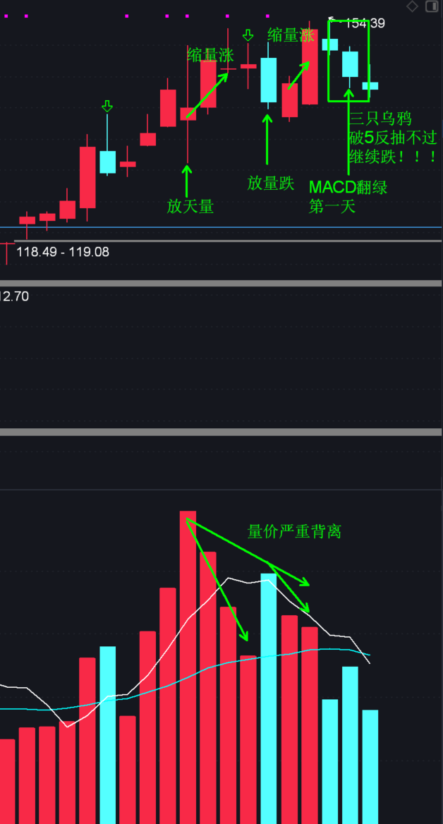 连续缩量上涨+MACD死叉+三只乌鸦+破5日线反抽失败,全剧终!保守预计,跌1个