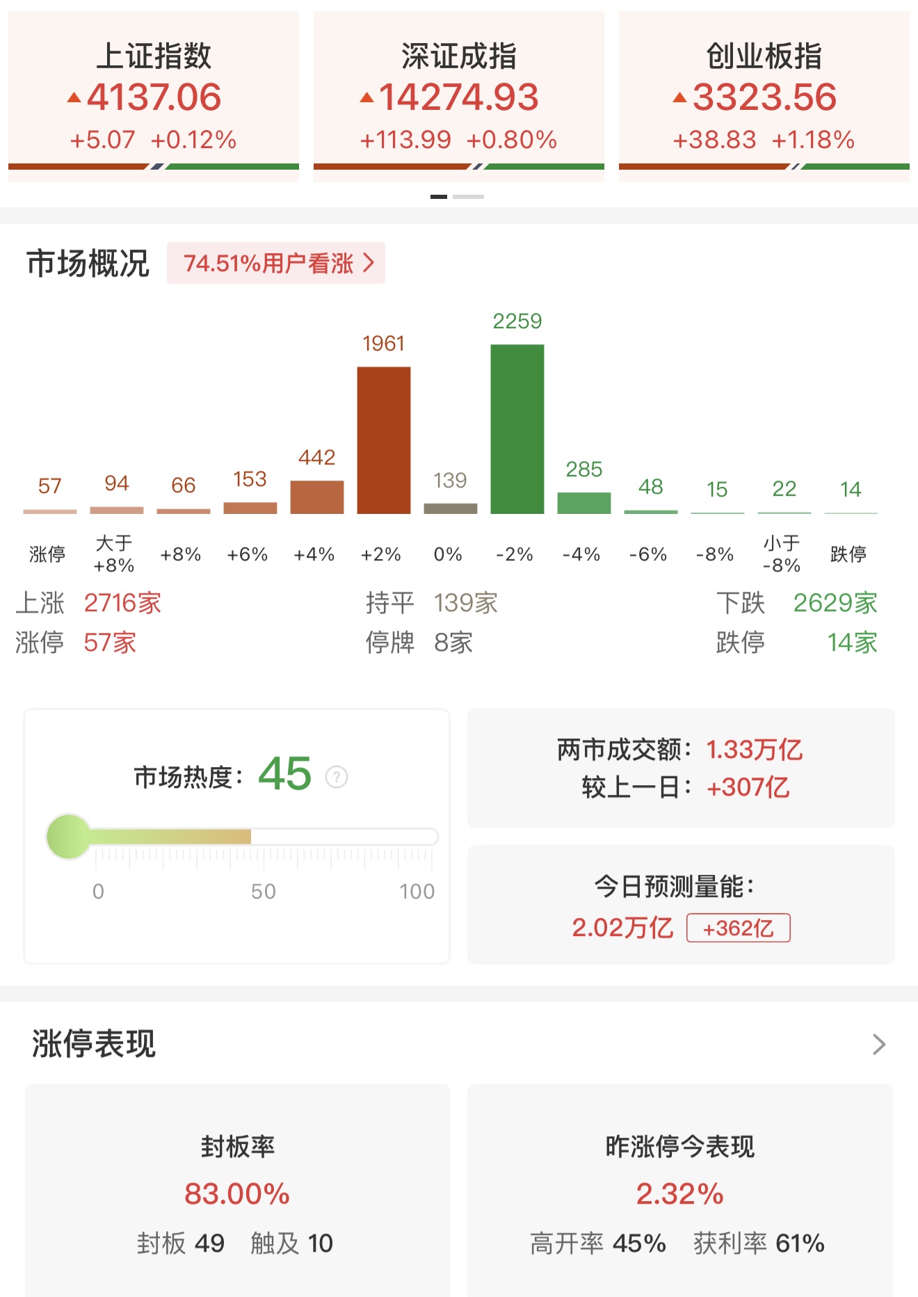 财联社2月12日电,沪指窄幅震荡,深成指、创业板指震荡拉升。沪深两市半日成交额1.33万亿,较上个交易日放量307亿。盘面上,热点快速轮动,全市场超2700只个股上涨。从板块来看,电网设备概念集体走强,思源电气、四方股份均创新高,望变电气、顺钠股份、森源电气涨停。有色金属板块反复活跃,翔鹭钨业5天3板,章源钨业2连板。CPO概念再度走强,天孚通信涨超10%续创历史新高。燃气轮机概念爆发,应流股份、常宝股份涨停。下跌方面,影视院线概念集体大跌,欢瑞世纪、横店影视、博纳影业跌停。截至收盘,沪指涨0.12%,深成指涨0.81%,创业板指涨1.18%。
