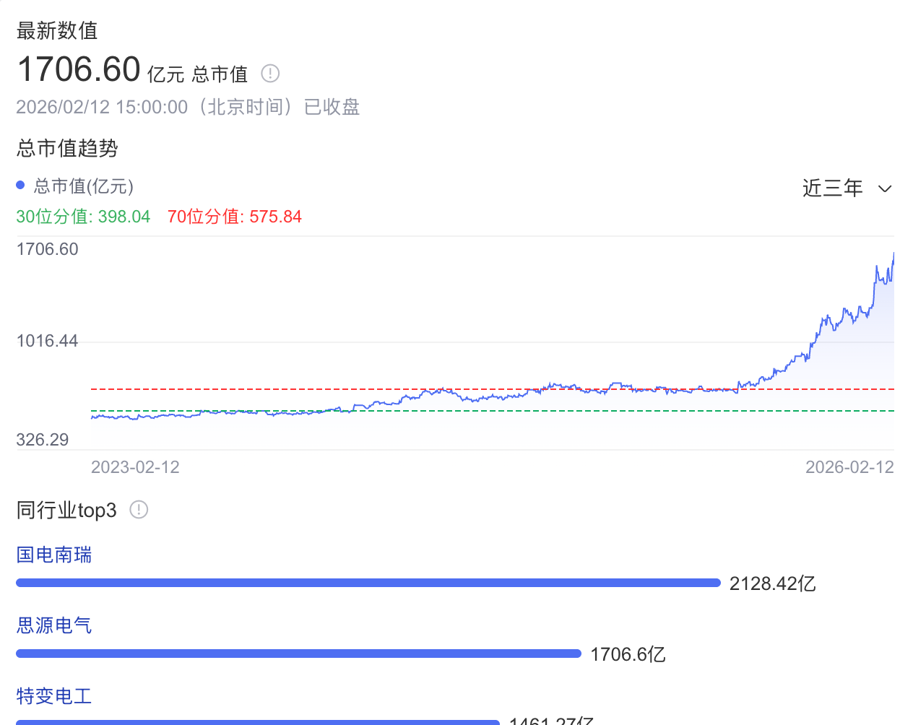 思源电气总部位于上海市闵行区,主要从事输变电设备的研发、生产与销售。1993年,思源电气从上海交通大学一间实验室起步,历经三十余年发展,已成长为全球领先的电力能源综合解决方案提供商。思源电气已于2004年在深圳证券交易所上市,截至2月12日收盘,公司A股股价报206.6元/股,总市值达1700亿元人民币。
