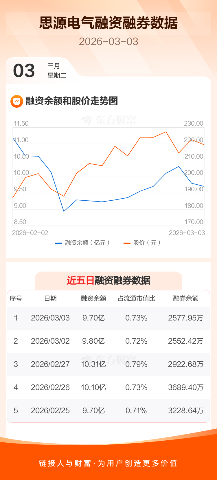 交易所最新数据显示,思源电气于2026年3月3日获融资买入8009.35万元,融资偿还8975.10万元,当日融资净偿还965.75万元。目前,该股融资余额9.70亿,占流通市值比例为0.73%。