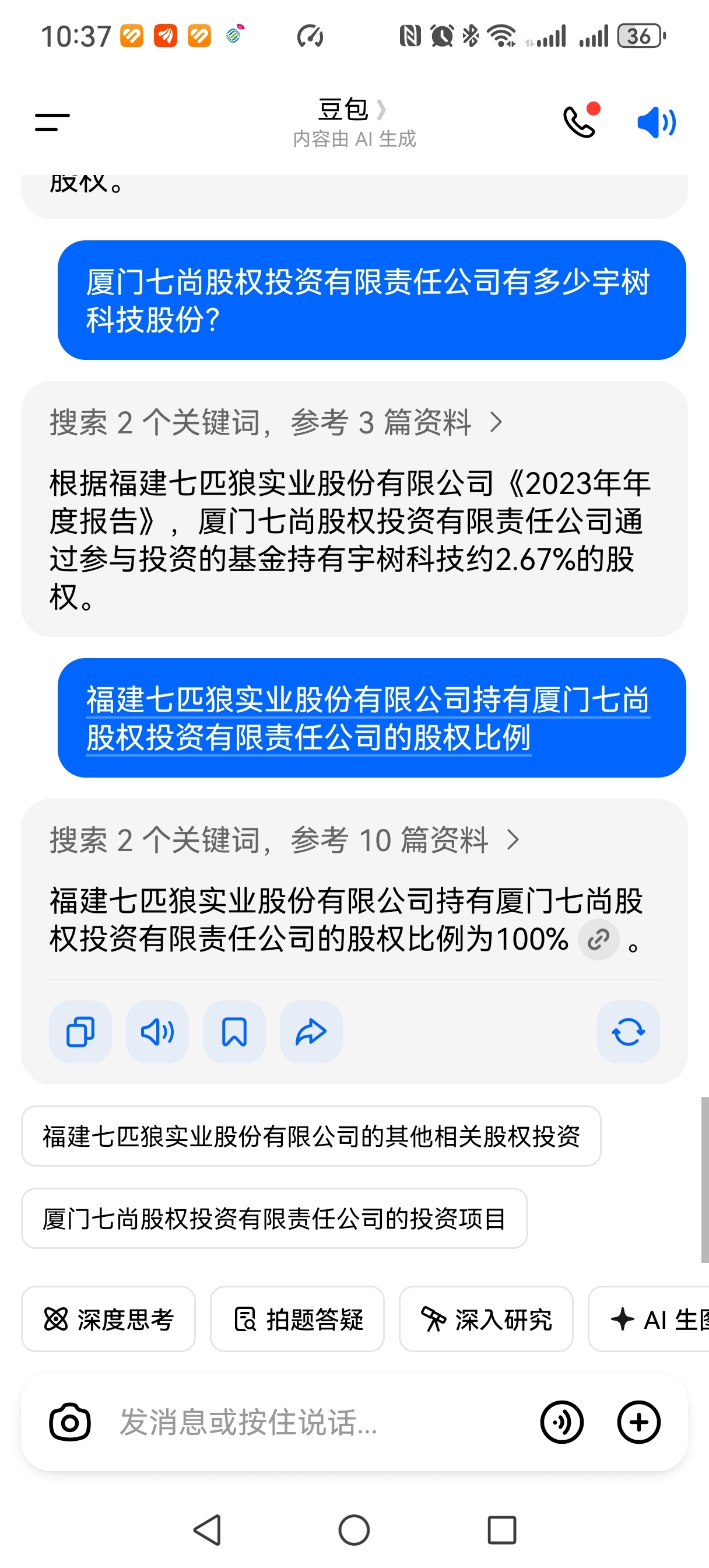 $七 匹 狼(SZ002029)$ 持有宇树科技2.67%股份……
