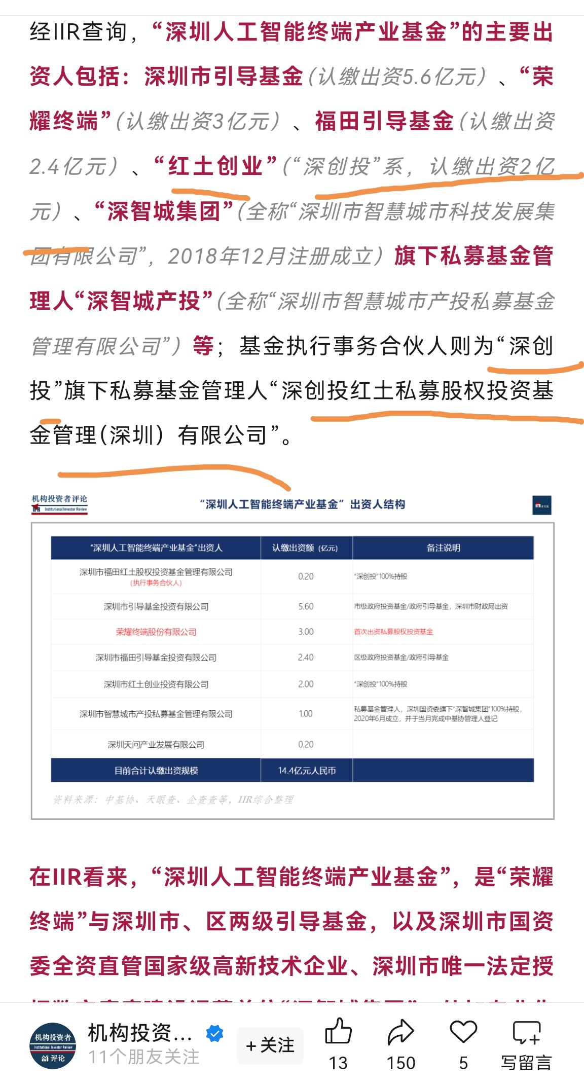 经查询,“深圳人工智能终端产业基金”的主要出资人包括:深圳市引导基金(认缴出资5.6亿元)、“荣耀终端”(认缴出资3亿元)、福田引导基金(认缴出资2.4亿元)、“红土创业”(“深创投”系,认缴出资2亿元)、“深智城集团”(全称“深圳市智慧城市科技发展集团有限公司”,2018年12月注册成立)旗下私募基金管理人“深智城产投”(全称“深圳市智慧城市产投私募基金管理有限公司”)等;基金执行事务合伙人则为“深创投”旗下私募基金管理人“深创投红土私募股权投资基金管理(深圳)有限公司”。