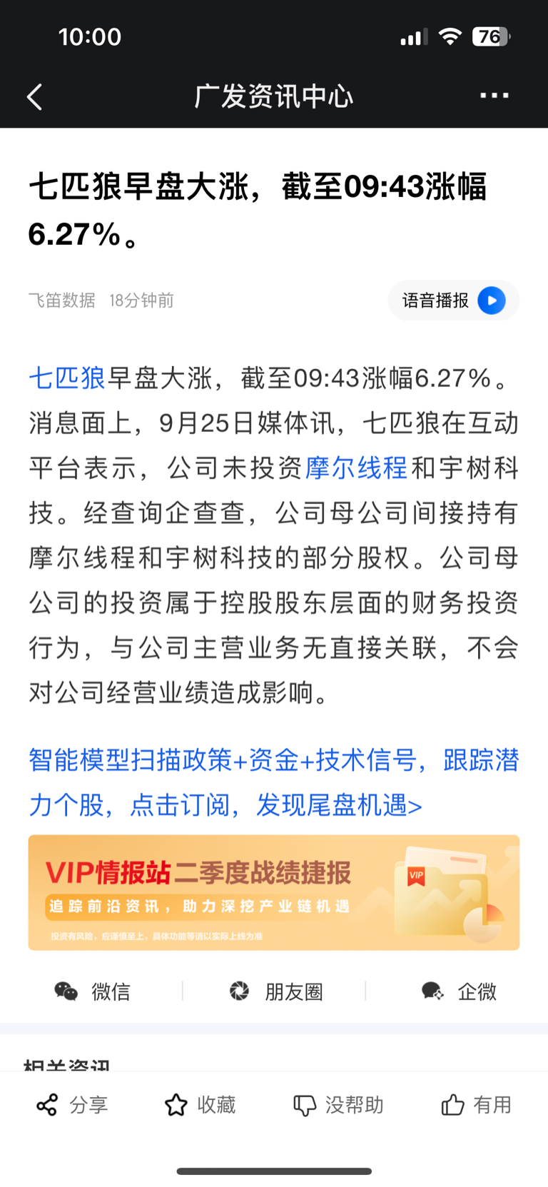 $七 匹 狼(SZ002029)$ 股市就是一个炒作的地方,宇树科技和摩尔线程跟公司根本没有联系,只跟其中的股东投资有关,对公司业绩根本没有帮助也能涨停,令我想起了豆腐脑机接口