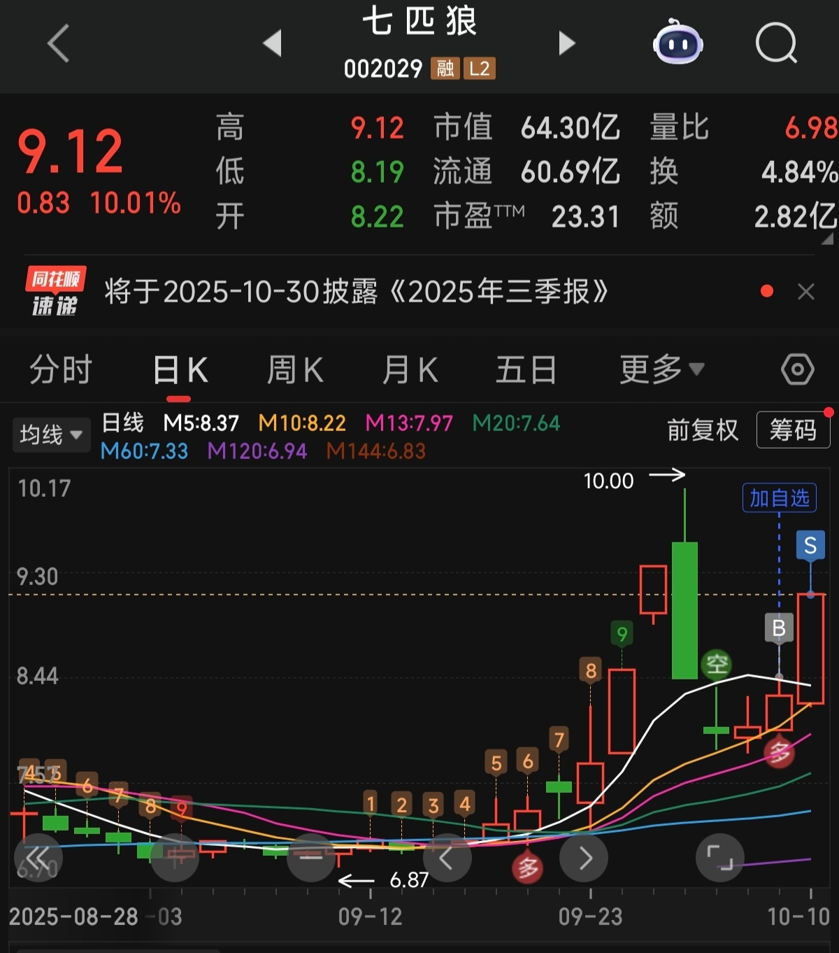 $七 匹 狼(SZ002029)$ 昨天买的,今天板上卖了,不知道对不对?