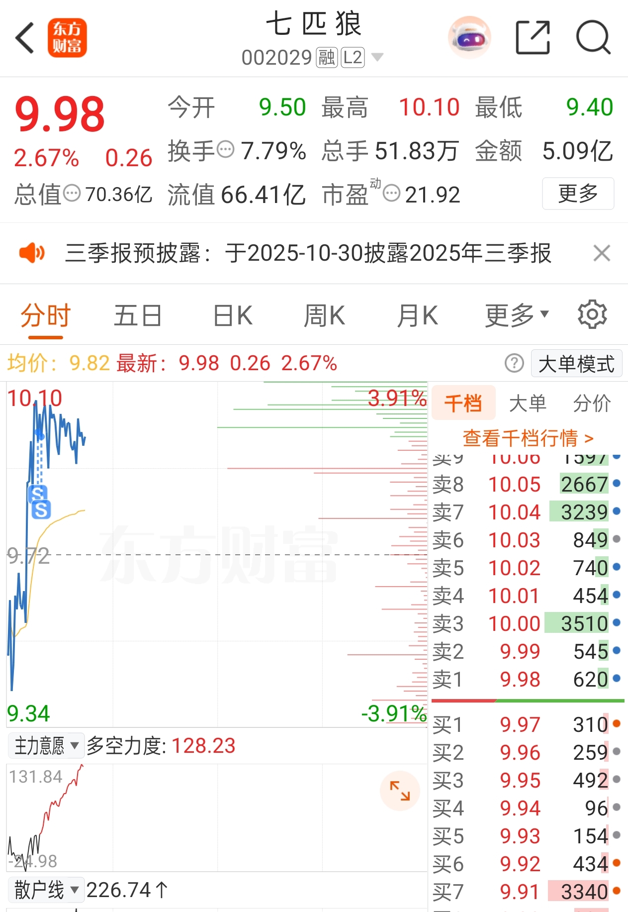 $七 匹 狼(SZ002029)$ 早上套利了,拉开安全区见后面他涨跌都能从后应付,目前持仓浮盈9个点,昨天我就说最多低开一下会拉起来,这么多大神在这唱空能跌下去就怪了