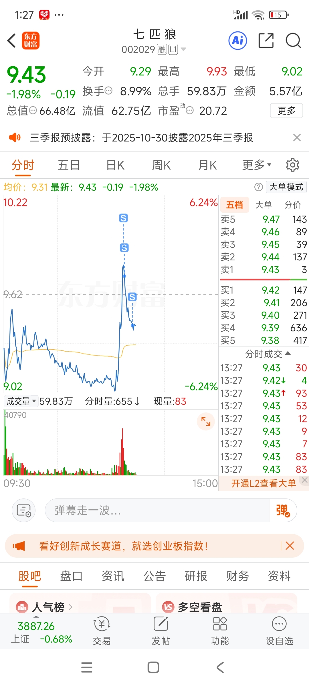 $七 匹 狼(SZ002029)$ 昨天9.56抄底,今天9.85高点卖了8层仓,还有2层也清了