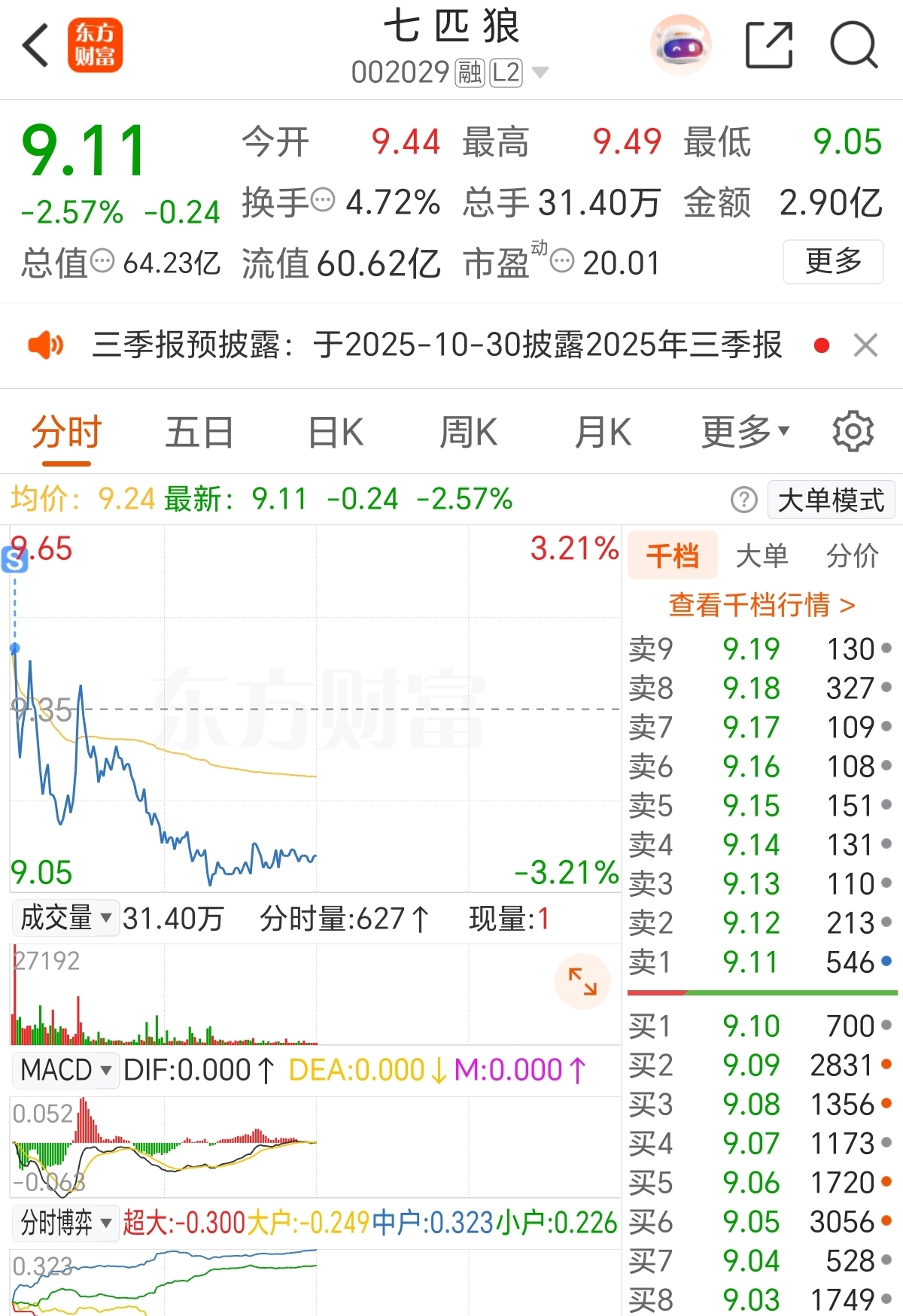 $七 匹 狼(SZ002029)$ 昨天9.10抄底的,今天成功跑路
