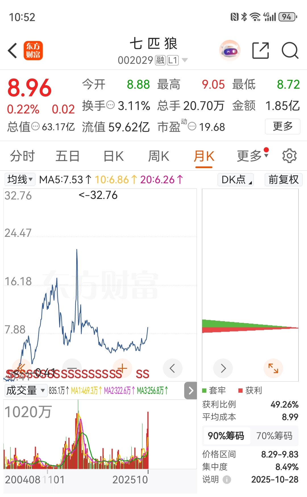 $七 匹 狼(SZ002029)$ 月K线的上升趋势明显啊!要不要入,还是再等等,大神什么时候可以进告诉我