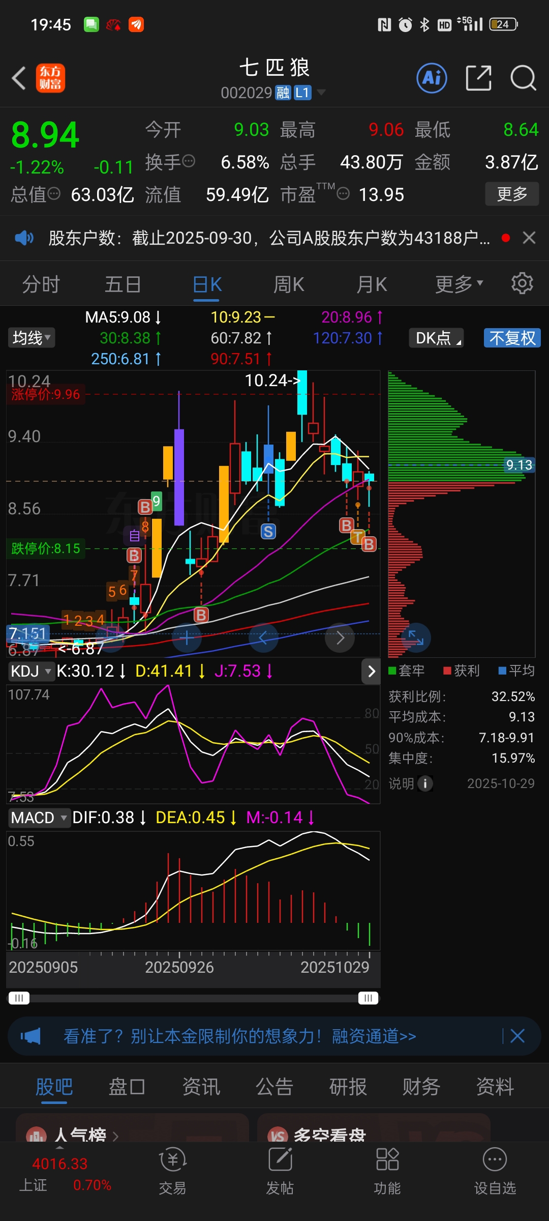 $七 匹 狼(SZ002029)$ 主力,我今天进来了。不要埋我