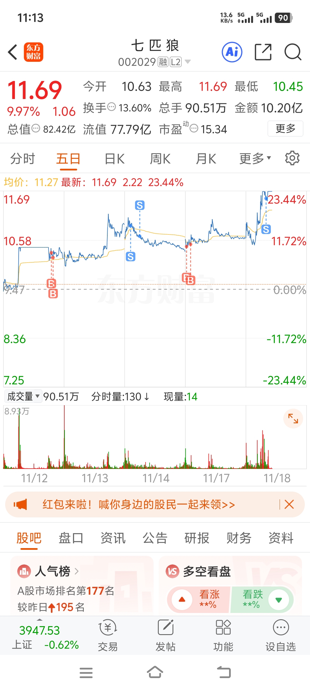 $七 匹 狼(SZ002029)$ 遗憾,走了百分之三十,打算下来做一个倒套,还是强!!!