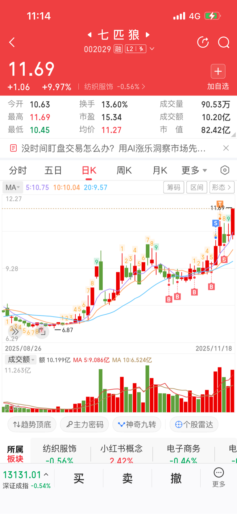 $七 匹 狼(SZ002029)$ 犹豫再三,准备涨停卖,收盘低点接回。看样子今天没有按剧本走,幸好没有自作聪明做T。上涨趋势,不动就是最好的操作。