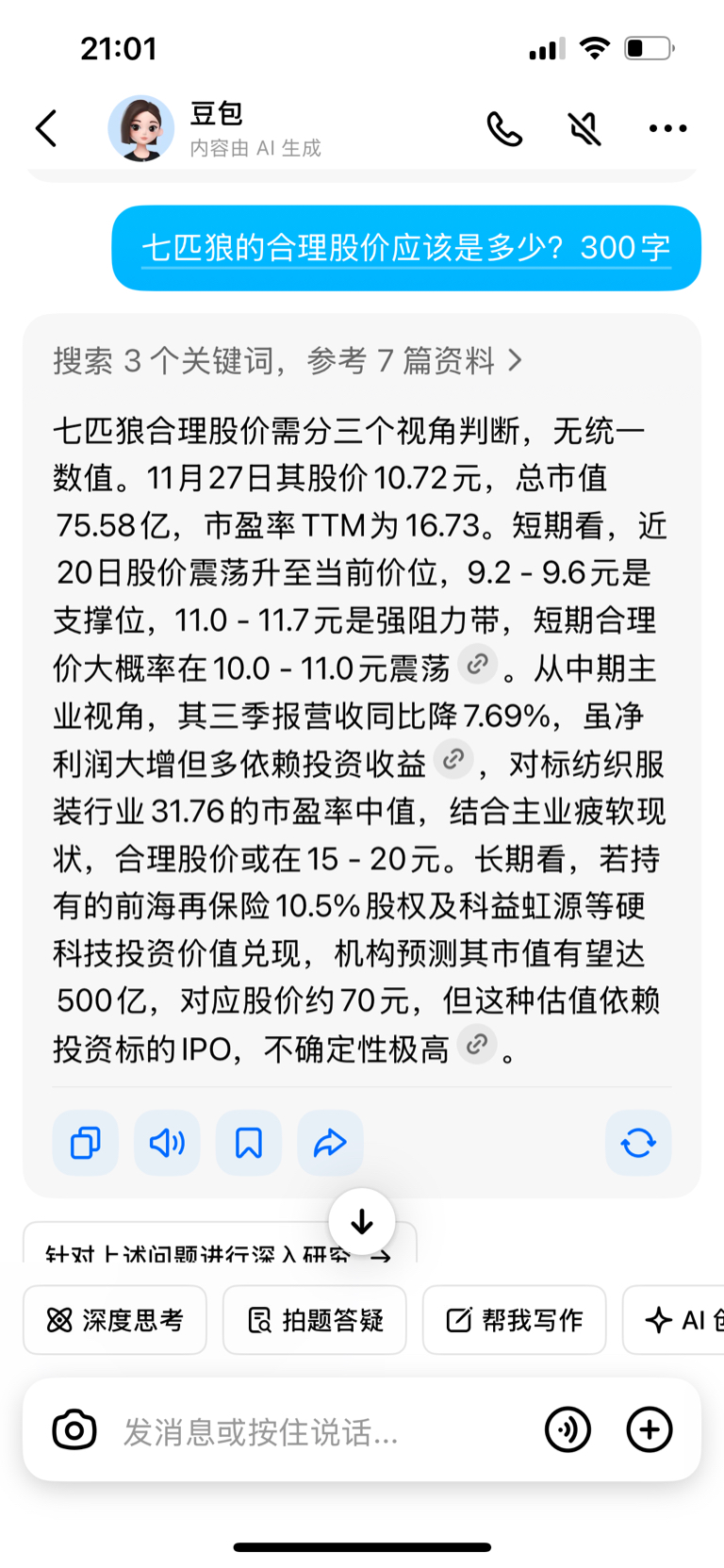 问问豆包,七匹狼的合理价格,兄弟们觉得怎么样?