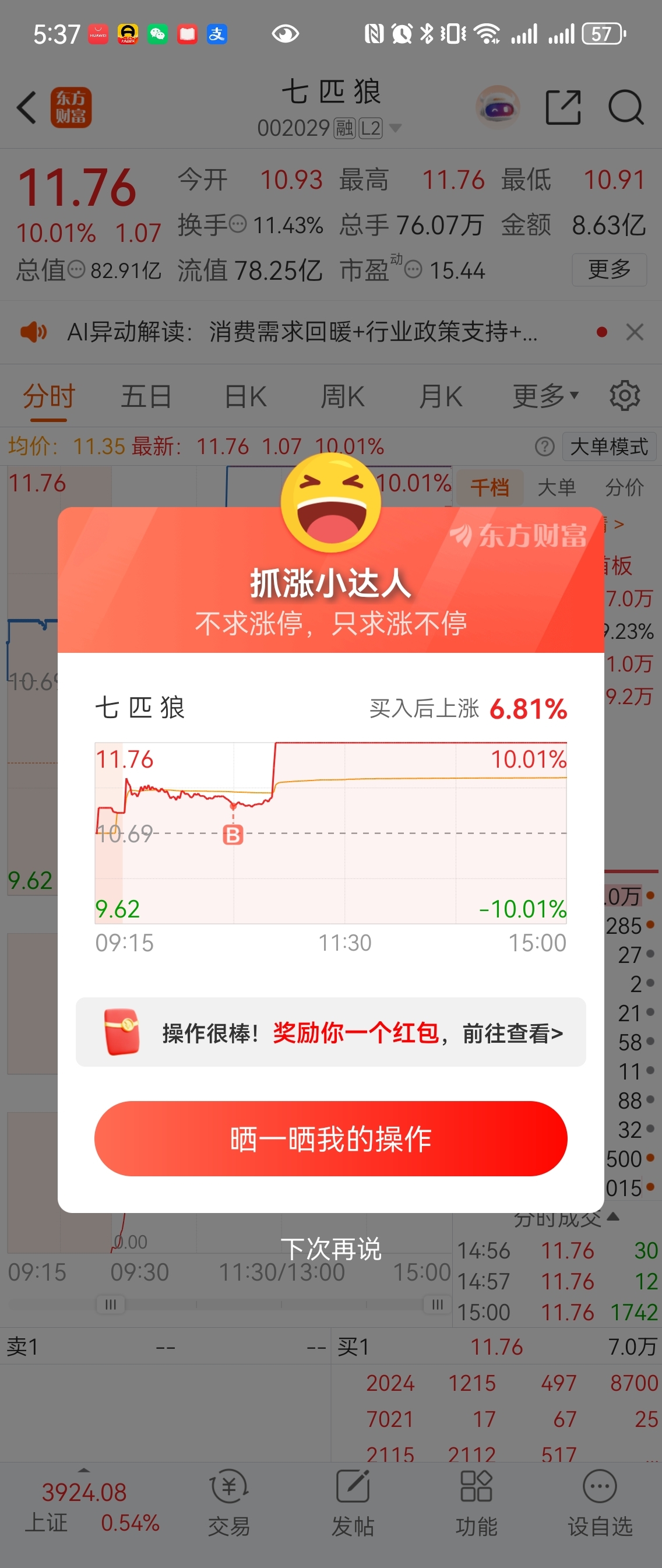 $七 匹 狼(SZ002029)$ 今天陪你 主力,你不走,我不走