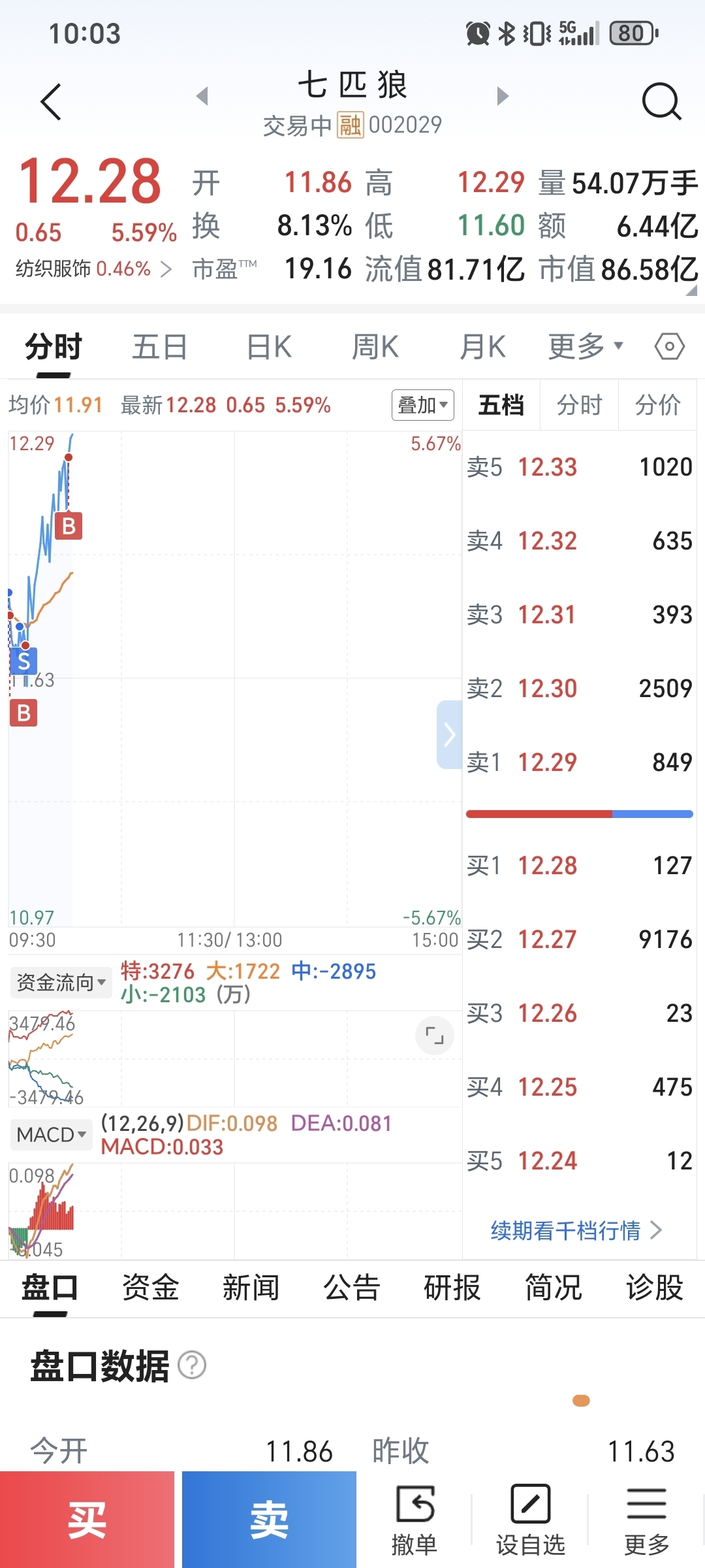 $七 匹 狼(SZ002029)$ 今天会拉板!冲!铁粉们!