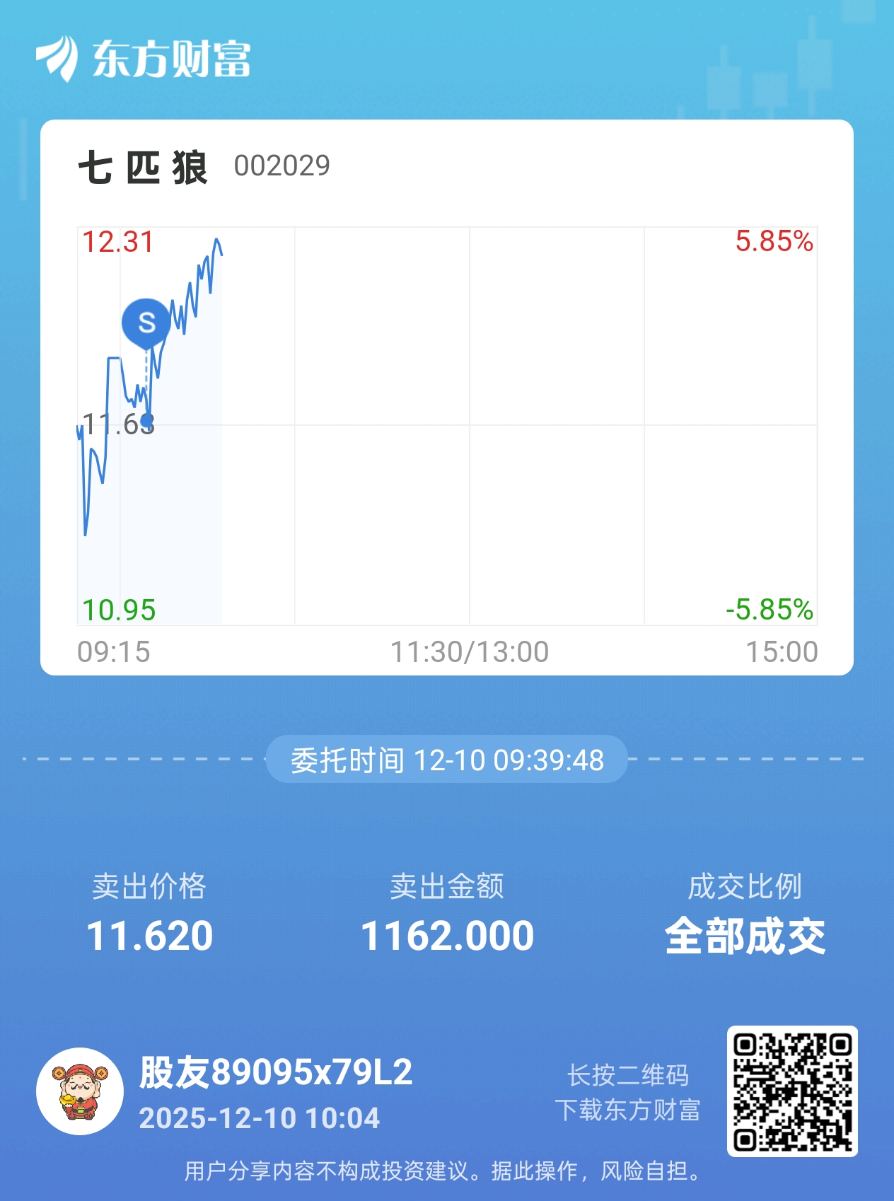 $七 匹 狼(SZ002029)$ 昨天追了就跌,今天出了就涨