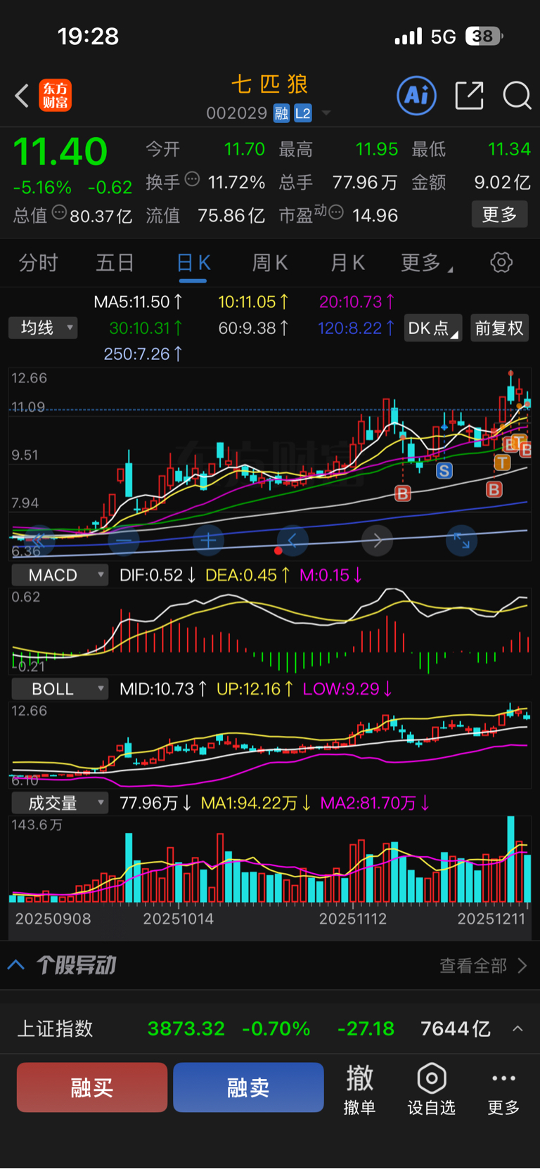 $七 匹 狼(SZ002029)$ 高位加仓一把亏光