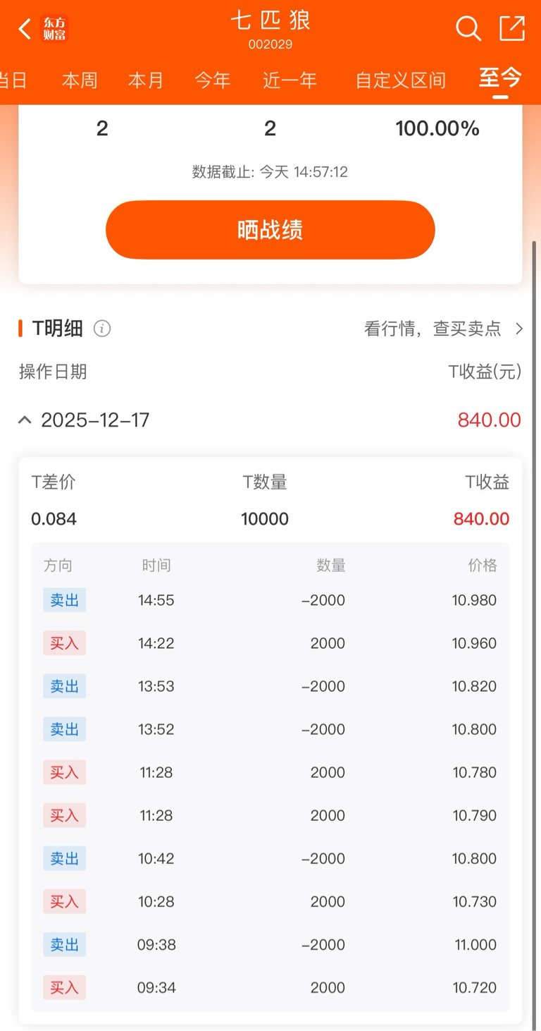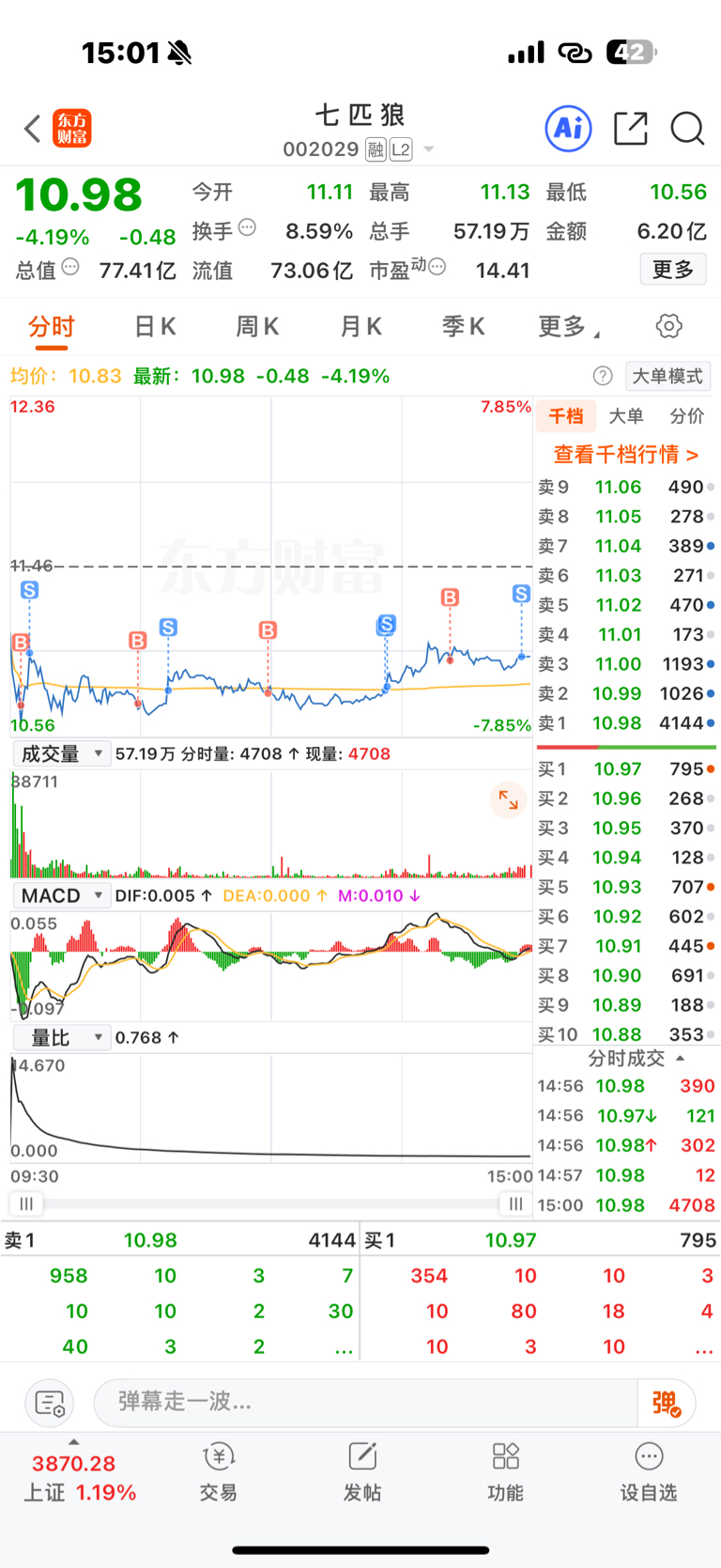 $七 匹 狼(SZ002029)$ 操作拉满了,这垃圾股,做T都不好做,全天绕着均线一两毛的动