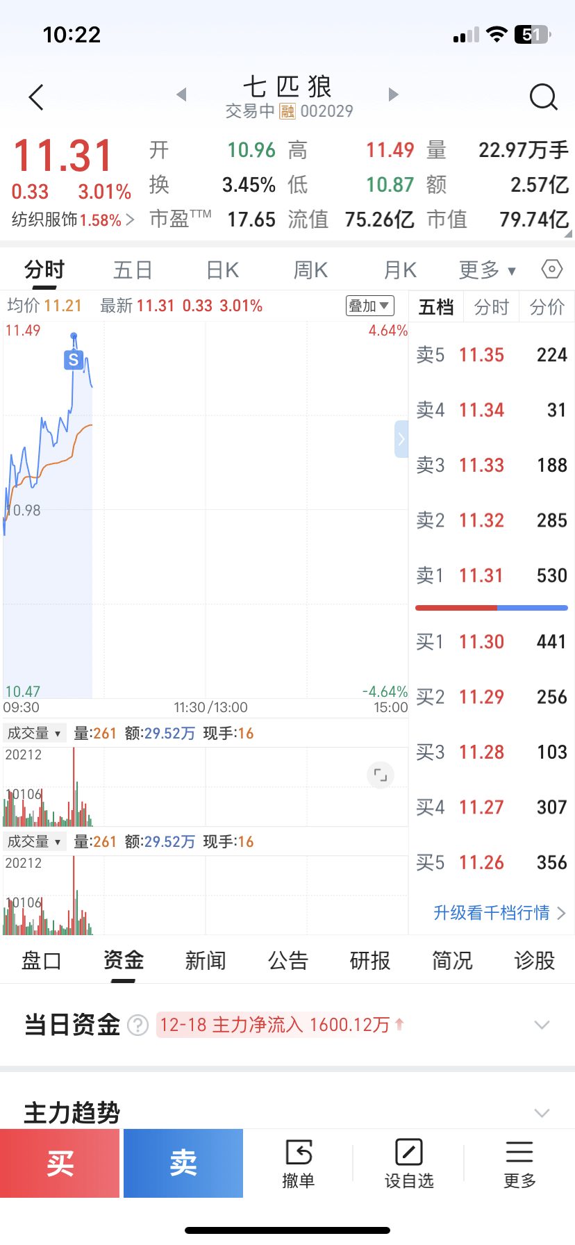 $七 匹 狼(SZ002029)$ 哈哈,昨天10.60进的 今天11.45出 不要太爽