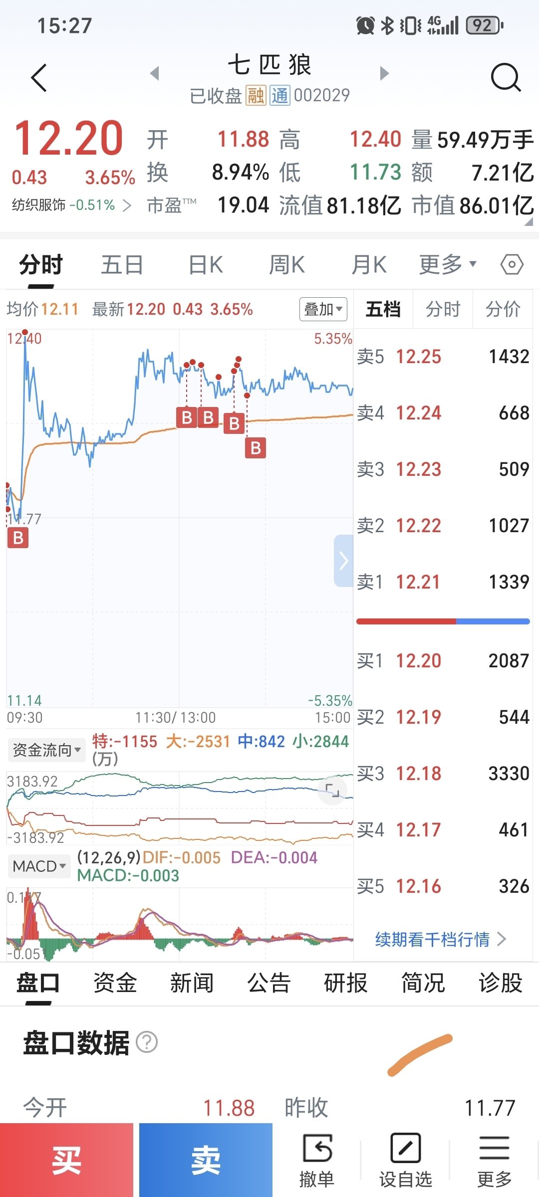 $七 匹 狼(SZ002029)$ 吸筹了一天,爽!