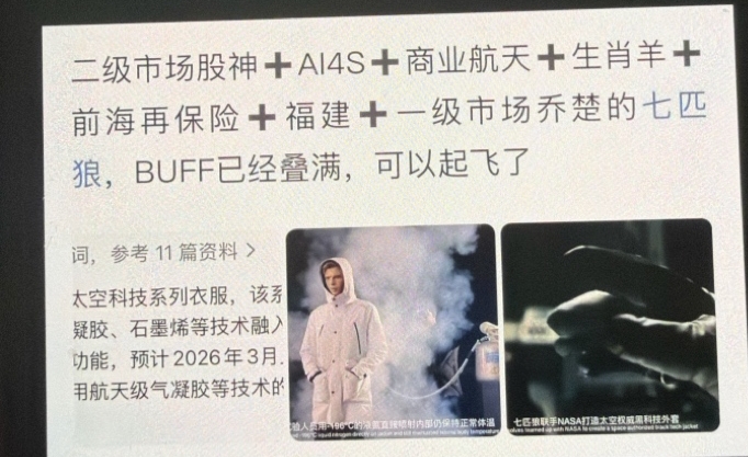 $七 匹 狼(SZ002029)$ (图片转发)。探索太空,移居另外星球,每人几件AI4S材料的衣服才能满足出行和飞行