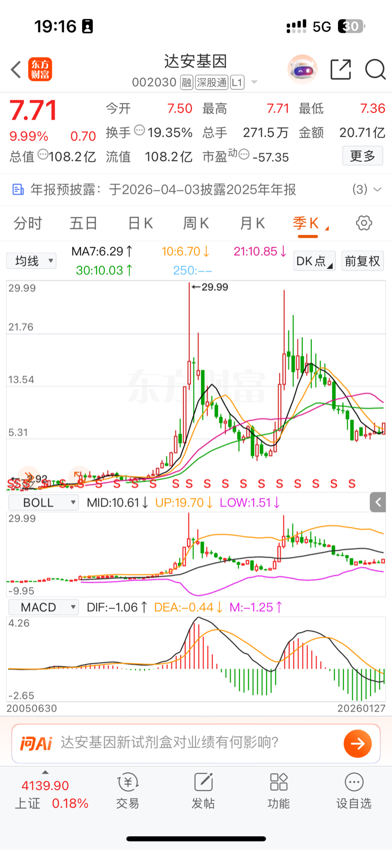 $达安基因(SZ002030)$ 这次月线级别的上涨一波行情要摸布林带上轨,二十元左右!