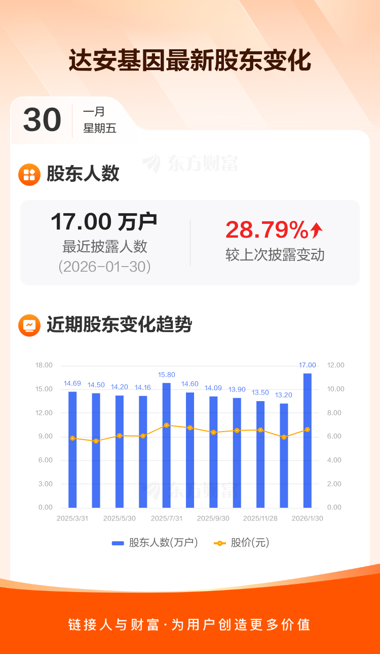 达安基因:截至1月30日最新股东户数17.00万户,较上期增加28.79%