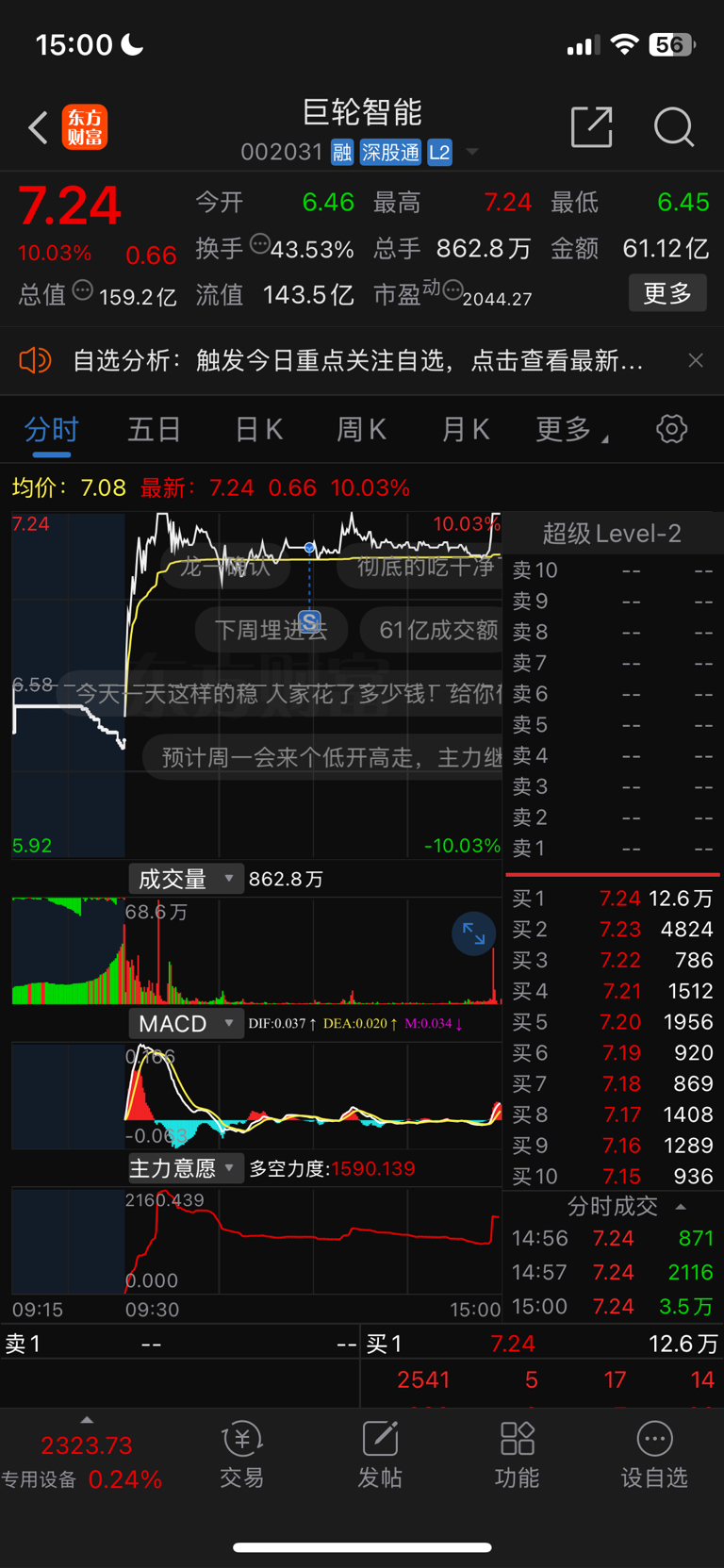 $巨轮智能(SZ002031)$ 今天运气不好 卖飞老公龙头了