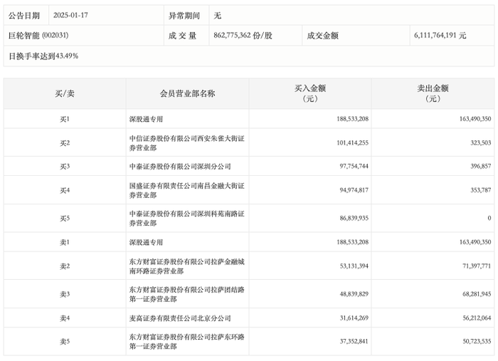 龙虎榜丨巨轮智能今日涨停 知名游资方新侠净买入1.01亿元