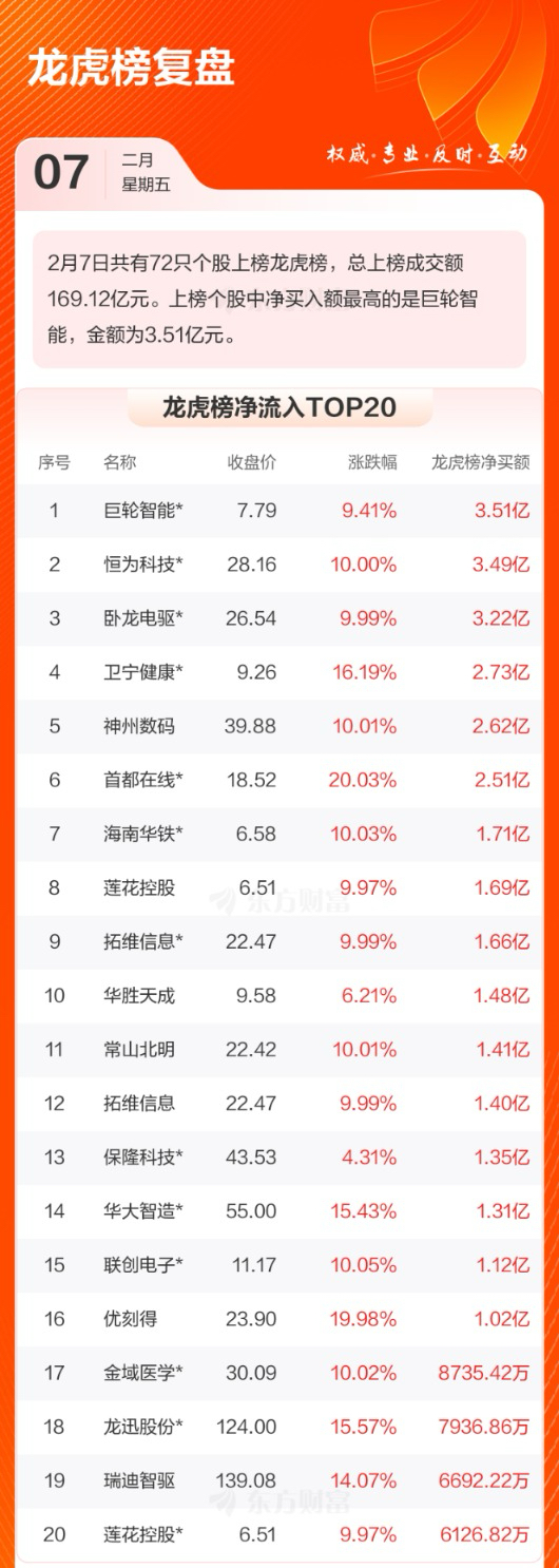 $巨轮智能(SZ002031)$ 明天2月10日,巨轮应该有好的表现,周五小作文撰手是身残志奸目的明确就是想要我们散户筹码,按周五收盘龙虎榜净买入巨轮流入第一3.51亿,机构买入榜第12名4264.80万,北向资金买入榜第一名1.76亿,游资木上榜,周一谁来砸盘?周一大盘不差的情况下应该续上涨,8.5前高应该会特破,只纯属个人观点,随便喷不介意!