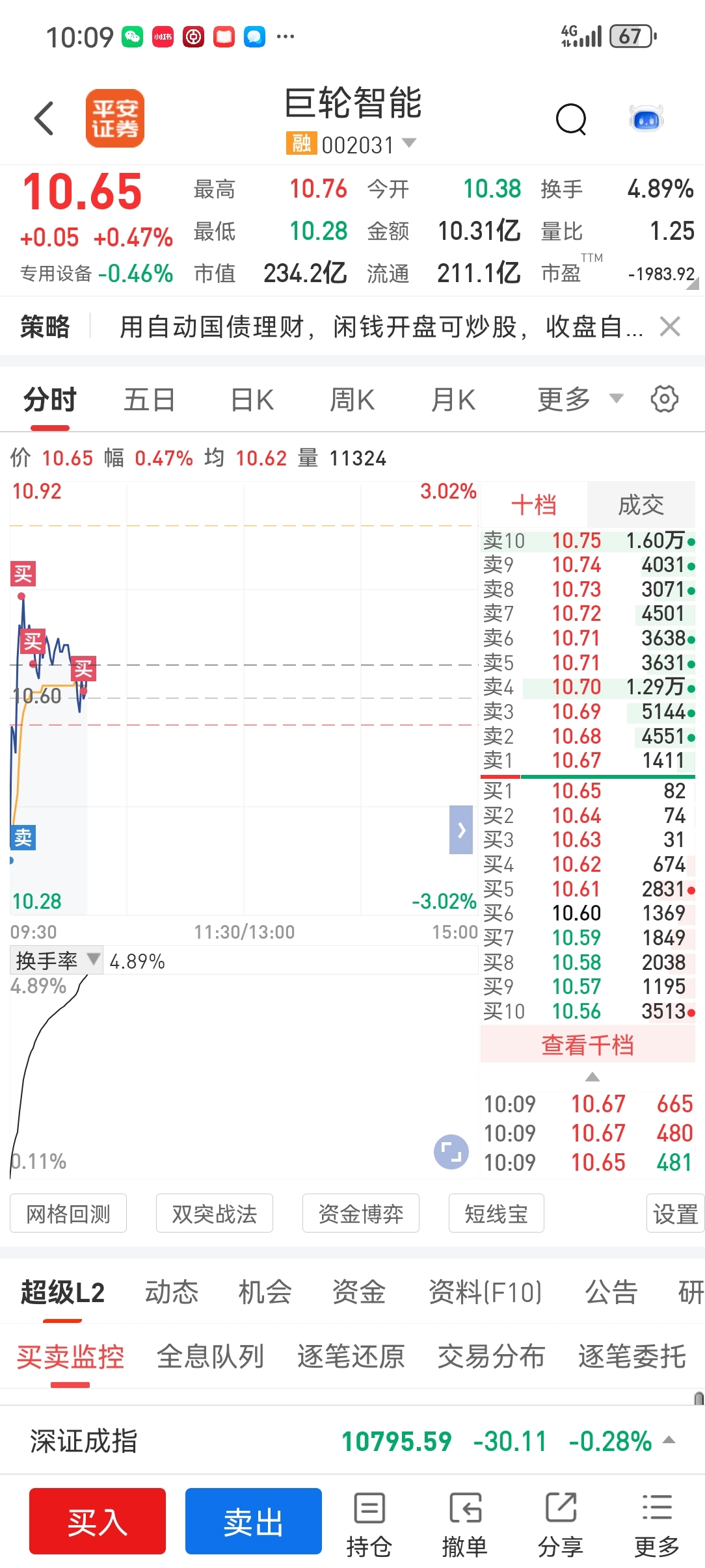 $巨轮智能(SZ002031)$ 有没有跟我一样的操作,本来开盘挂单卖了想着跌五六个点再买回来,没想到开盘成交了