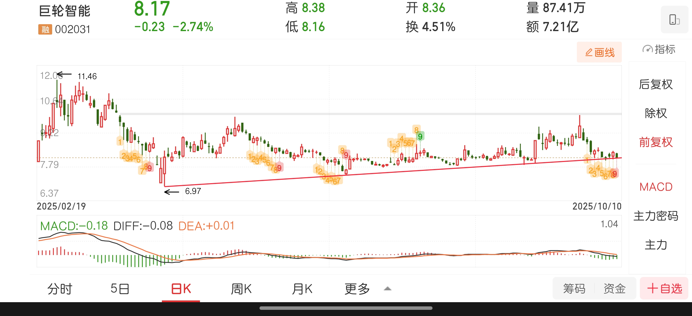 $巨轮智能(SZ002031)$ 今天抄的是否有点盲目呢?复盘后发现一切都刚刚好,这条趋势支撑是否有效呢?下个礼拜一,一旦跌破不修复就要赶紧跑,反之就耐心持好!