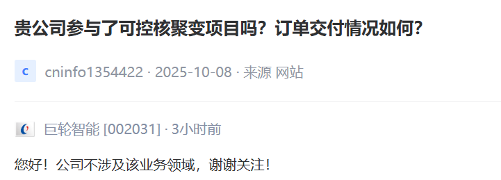 上证报中国证券网讯巨轮智能16日在互动平台澄清:公司不涉及可控核聚变业务领域。