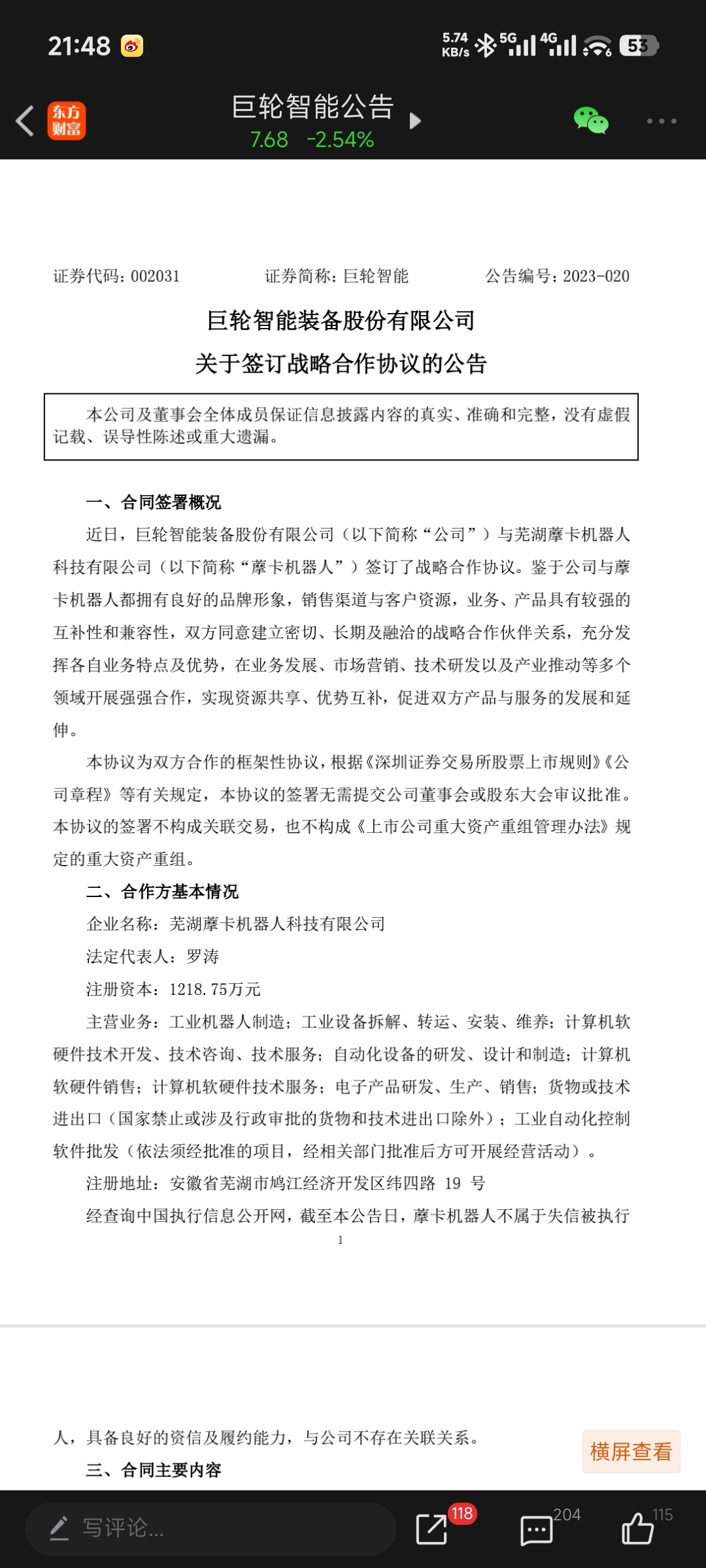 $巨轮智能(SZ002031)$ 这个就是那个说的机器人公司吧,2023年的合作消息,说到现在,董秘回复了这么多年。