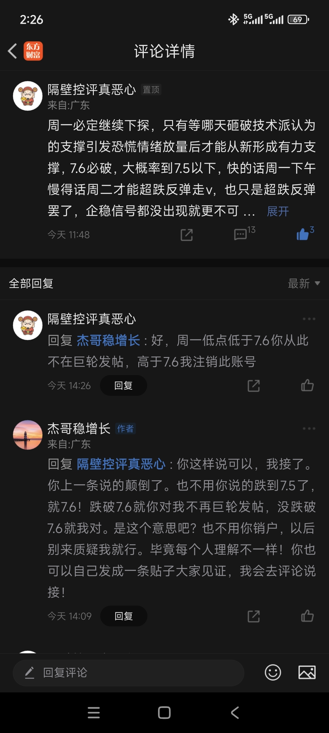 $巨轮智能(SZ002031)$ 各位拿破仑见证一下,我和杰哥对赌周一低点低于7.60他从此不在巨轮发帖,高于7.6我注销这个账号。