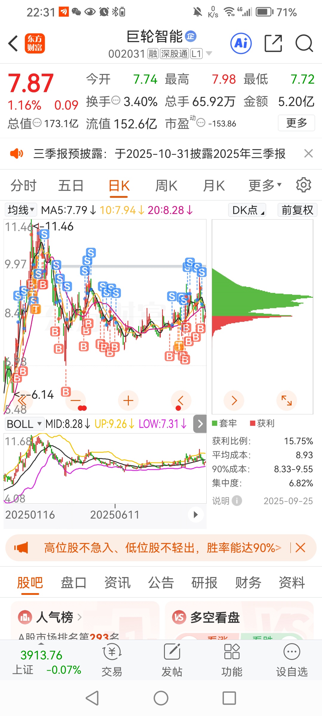 明天23号周四板块跟大盘不一定给力,但巨轮不会差到哪去!连续三天没有跌破7.66(我坚持的低点,我个人还在7.69加仓),我踏马搞不懂的是还有人认为我是托,要不要我把去年到现在巨轮的买卖点给你们看。