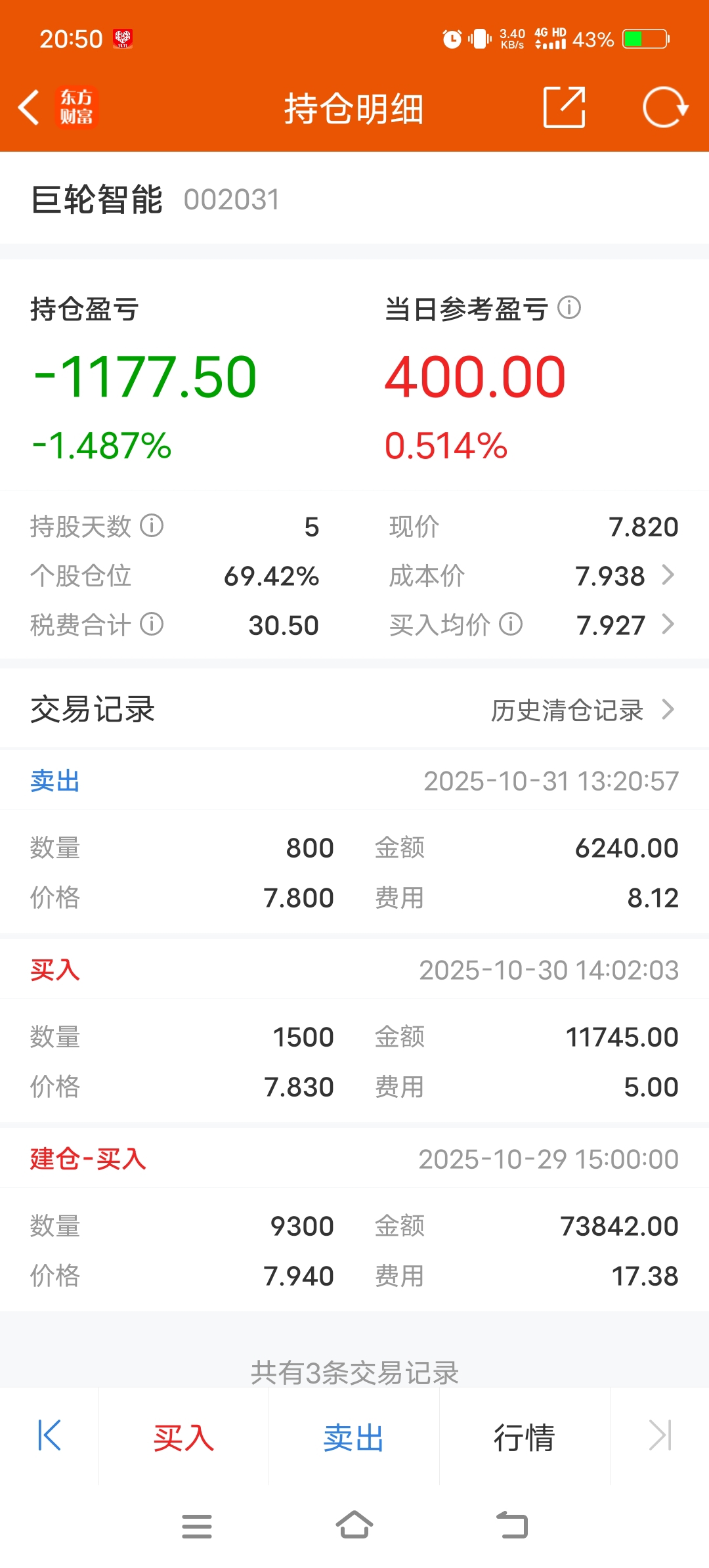 $巨轮智能(SZ002031)$ 持股第五天,慢慢回血