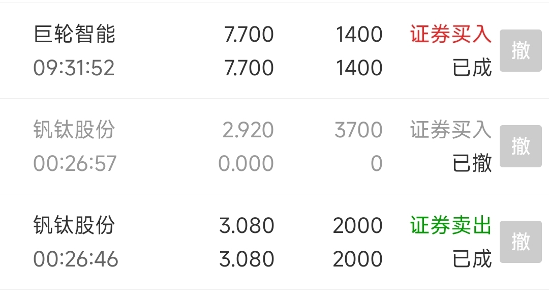 $巨轮智能(SZ002031)$ 后悔死了,钒钛股份涨停了,提前挂的308忘记撤了,不该撤钒钛买巨轮