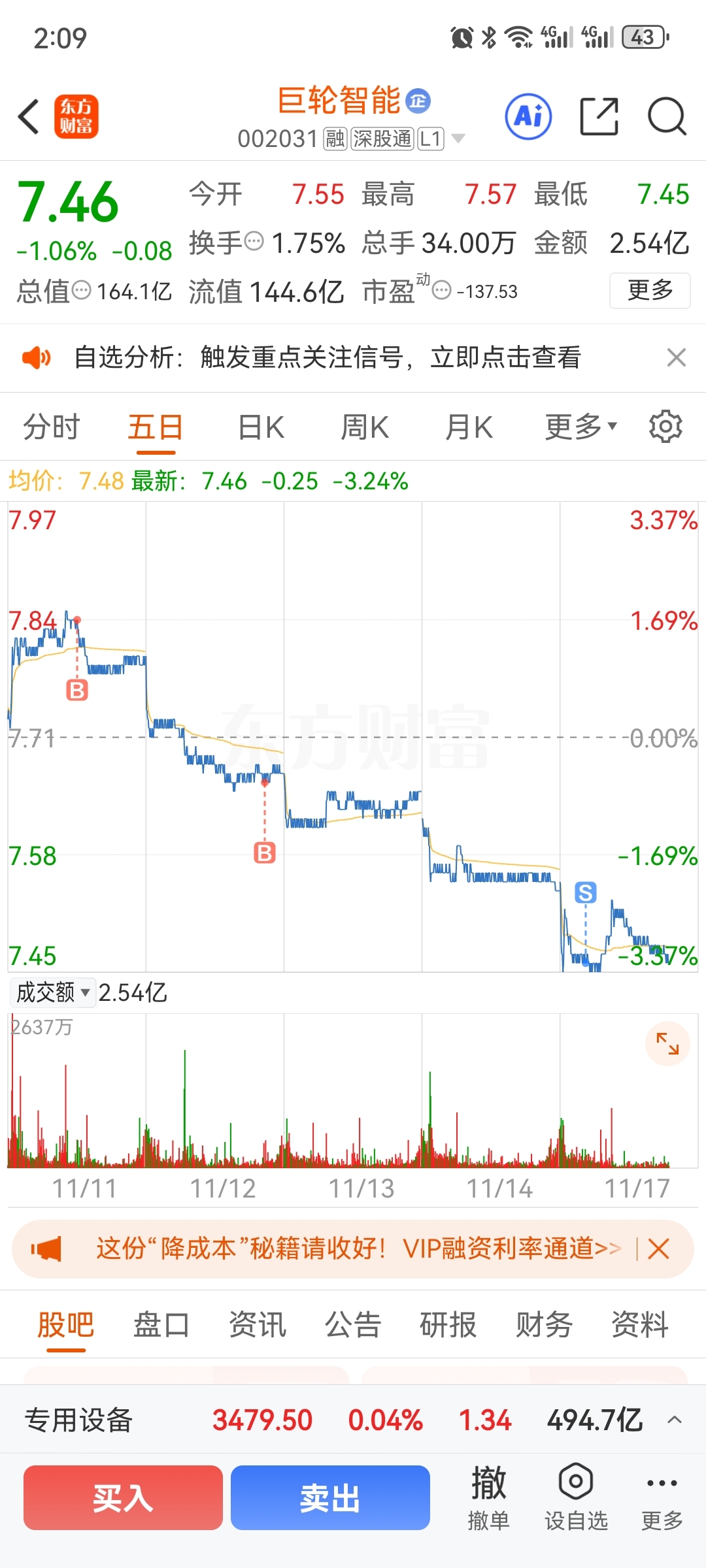 $巨轮智能(SZ002031)$ 割肉了砸毛鸟