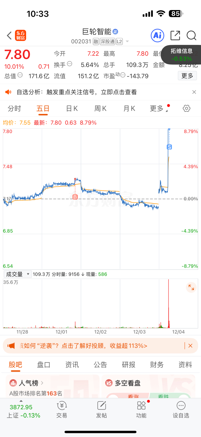 $巨轮智能(SZ002031)$ 卖飞体质,祝留下发财