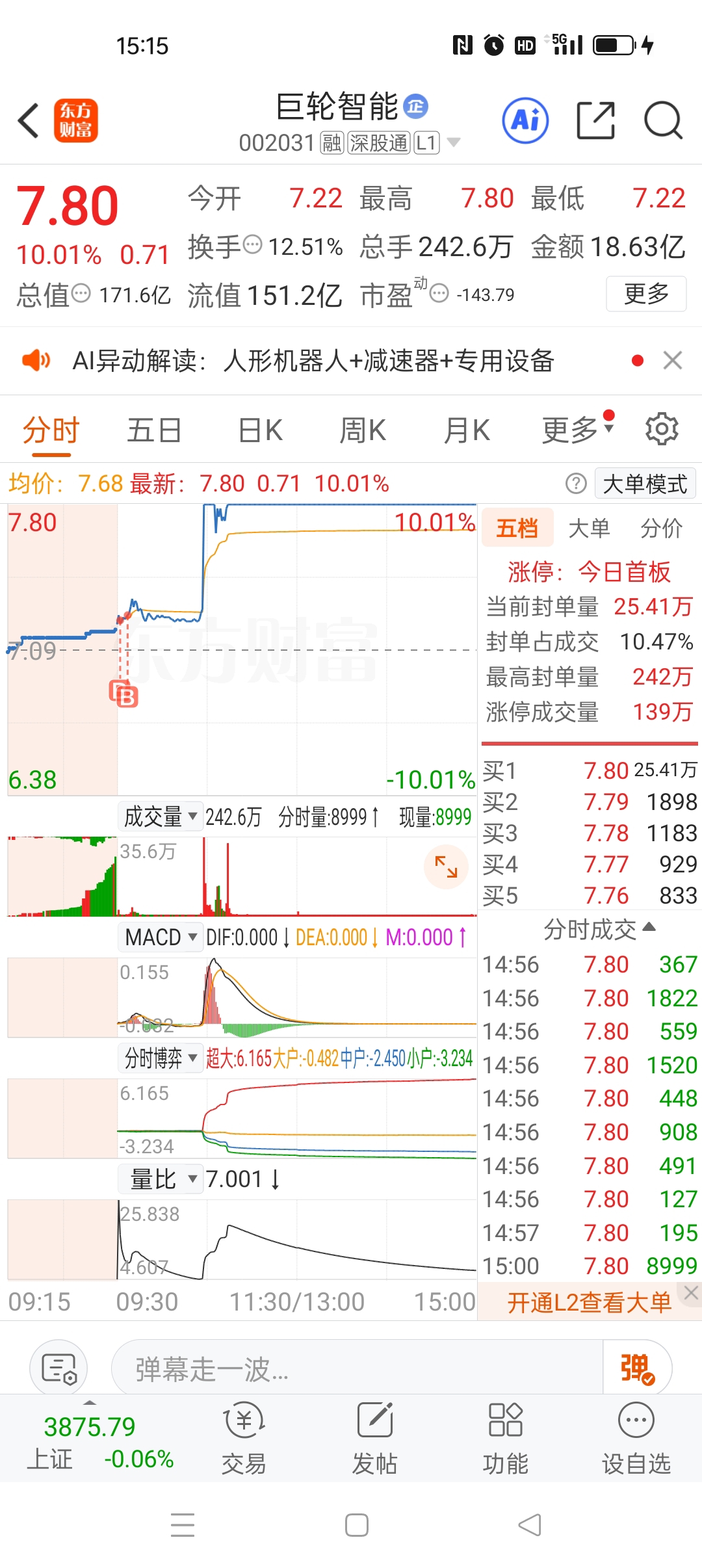 $巨轮智能(SZ002031)$ 好家伙一个板人气涨了近800