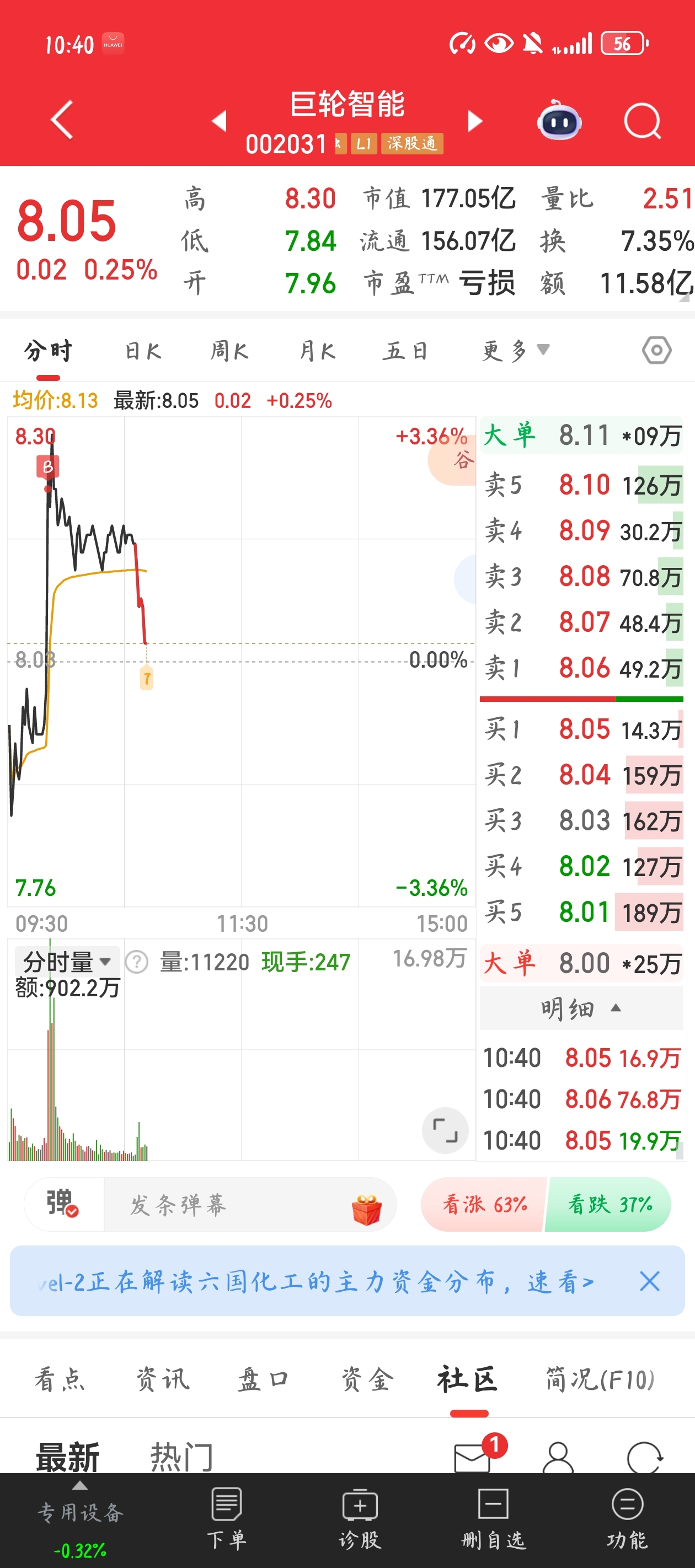 $巨轮智能(SZ002031)$ 我朋友给我发的截图,笑死我了,他说主力就盯着他那仨瓜俩枣。