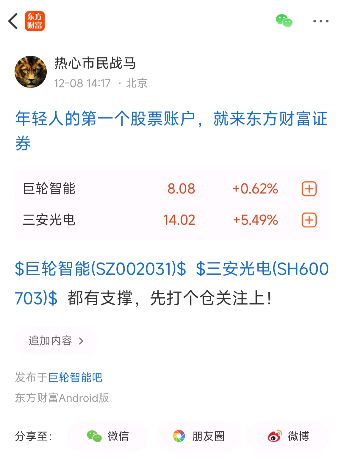 温馨提示: 1.根据《证券法》规定,禁止编造、传播虚假信息或者误导性信息,扰乱证券市场;2.用户在本社区发表的所有资料、言论等仅代表个人观点,与本网站立场无关,不对您构成任何投资建议。用户应基于自己的独立判断,自行决定证券投资并承担相应风险。《东方财富社区管理规定》