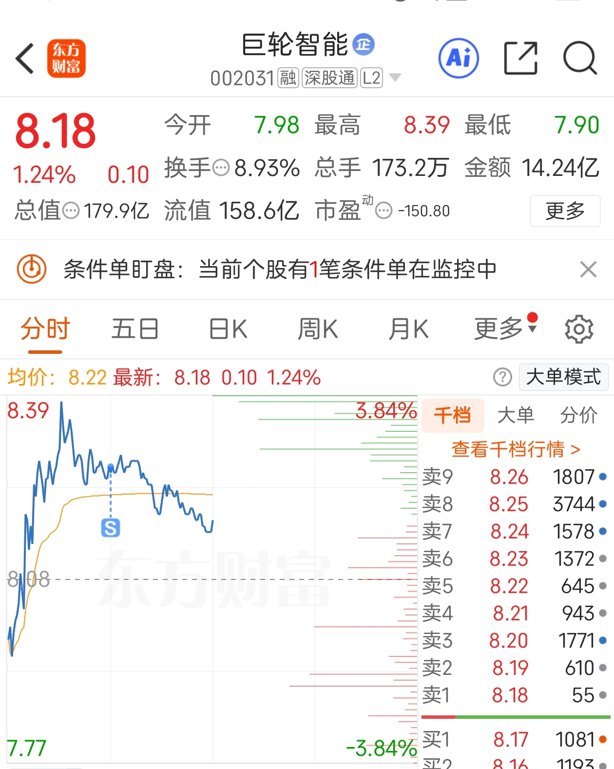 $巨轮智能(SZ002031)$ 韭菜猜猜为啥不高位跑?