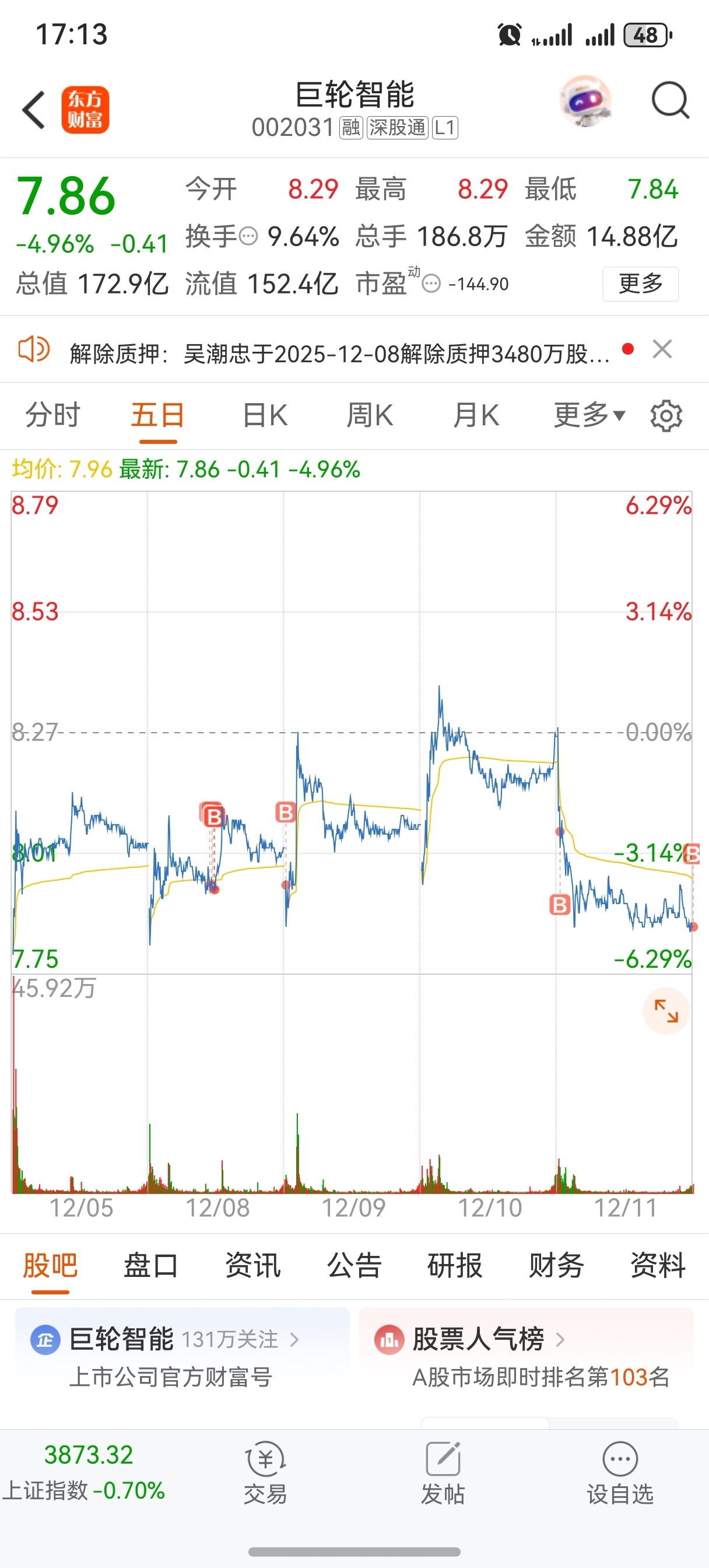 $巨轮智能(SZ002031)$ 终于加到了便宜筹码仓了,静待花开